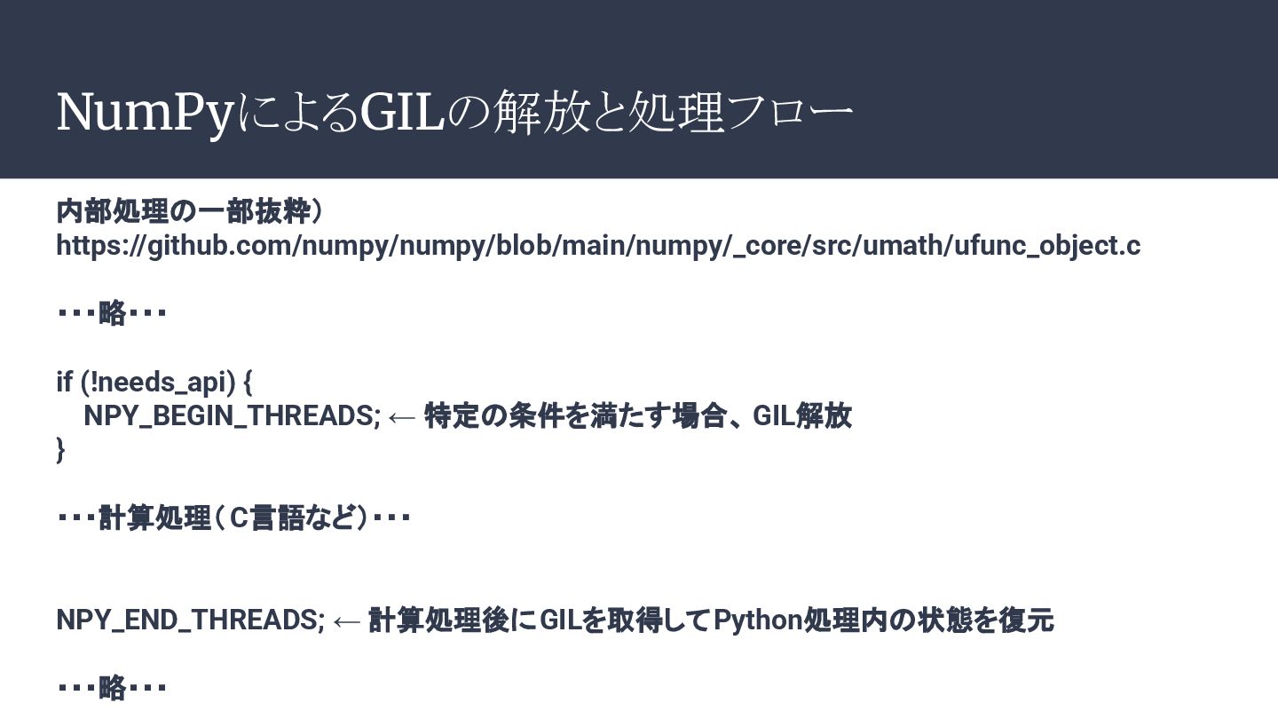 NumPyによるGILの解放と処理フロー 内部処理の一部抜粋) https://github.com/numpy/numpy/blob/main/numpy/_core/src/umath/ufunc_object.c ・・・略・・・ if (!needs_api) { NPY_BEGIN_THREADS; ← 特定の条件を満たす場合、