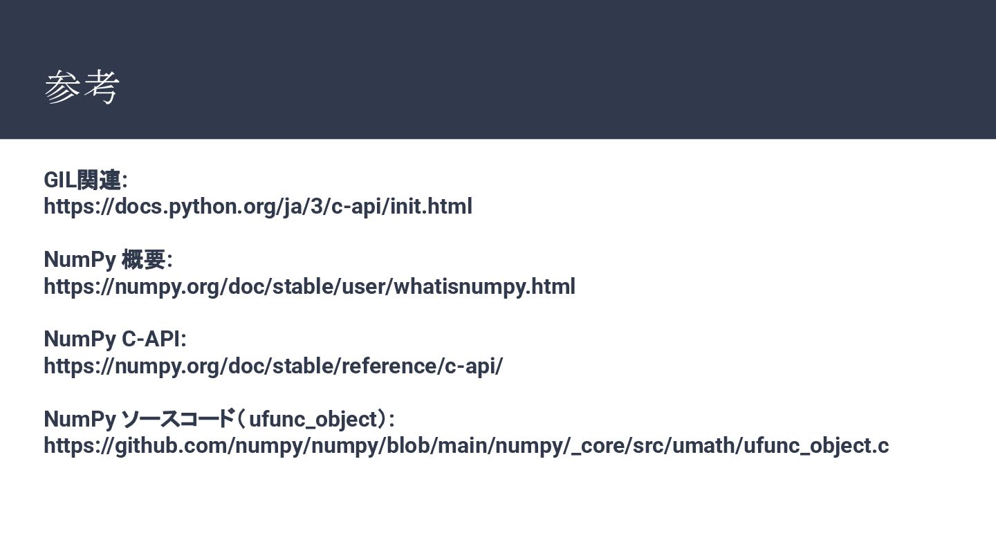 GIL関連: https://docs.python.org/ja/3/c-api/init.html NumPy 概要: https://numpy.org/doc/stable/user/whatisnumpy.html NumPy C-API: https://numpy.org/doc/stable/reference/c-api/ NumPy ソースコード(ufunc_object):