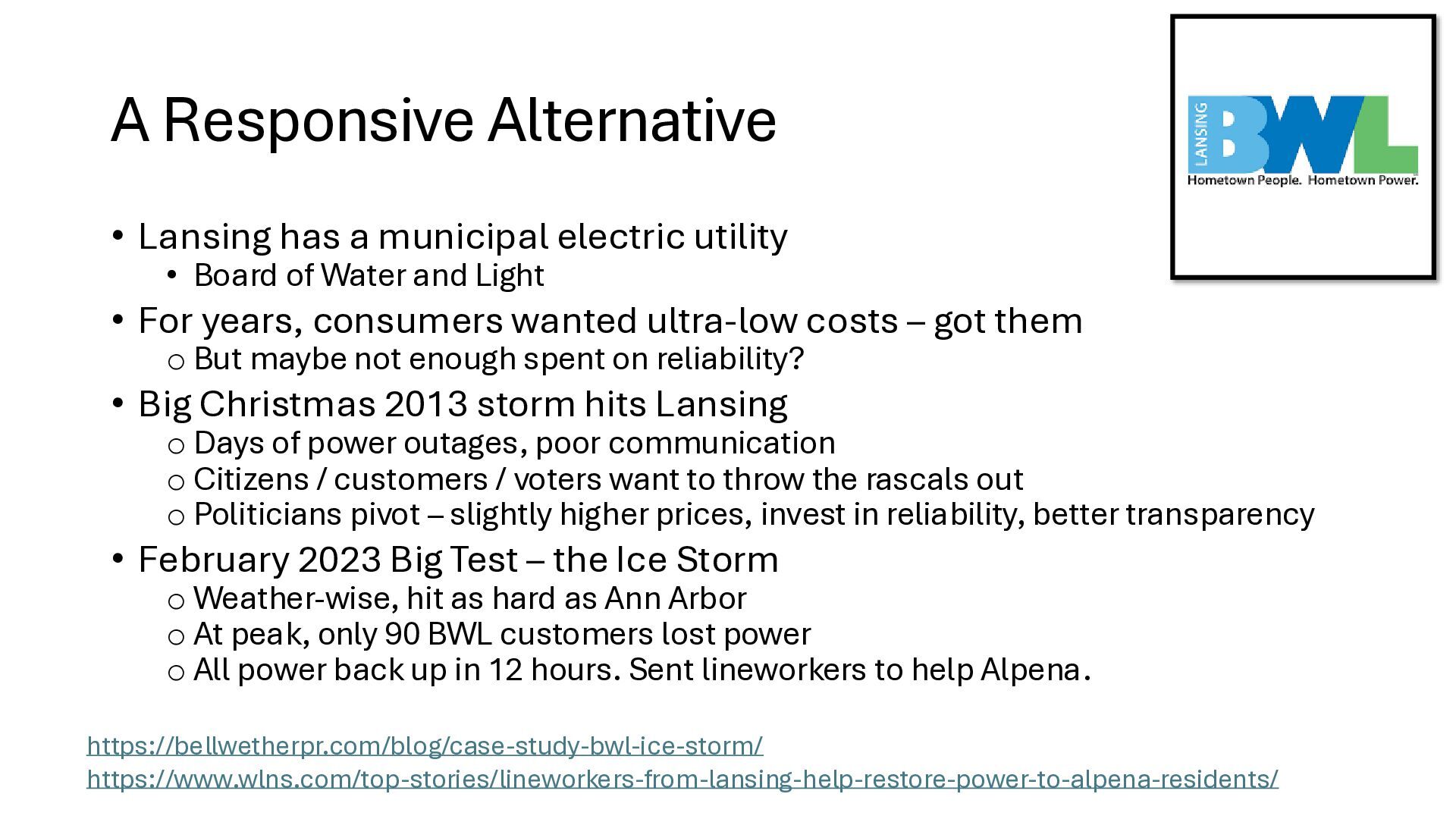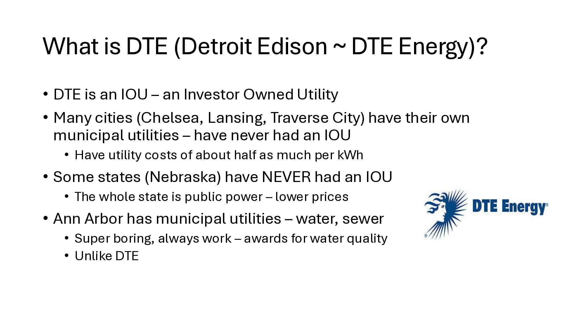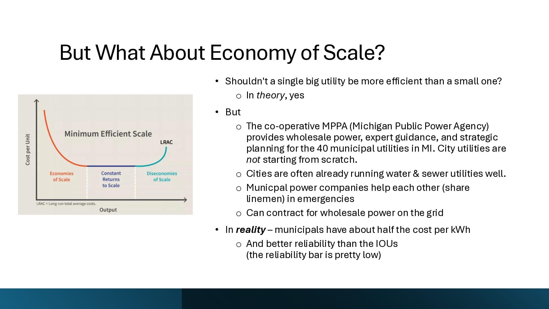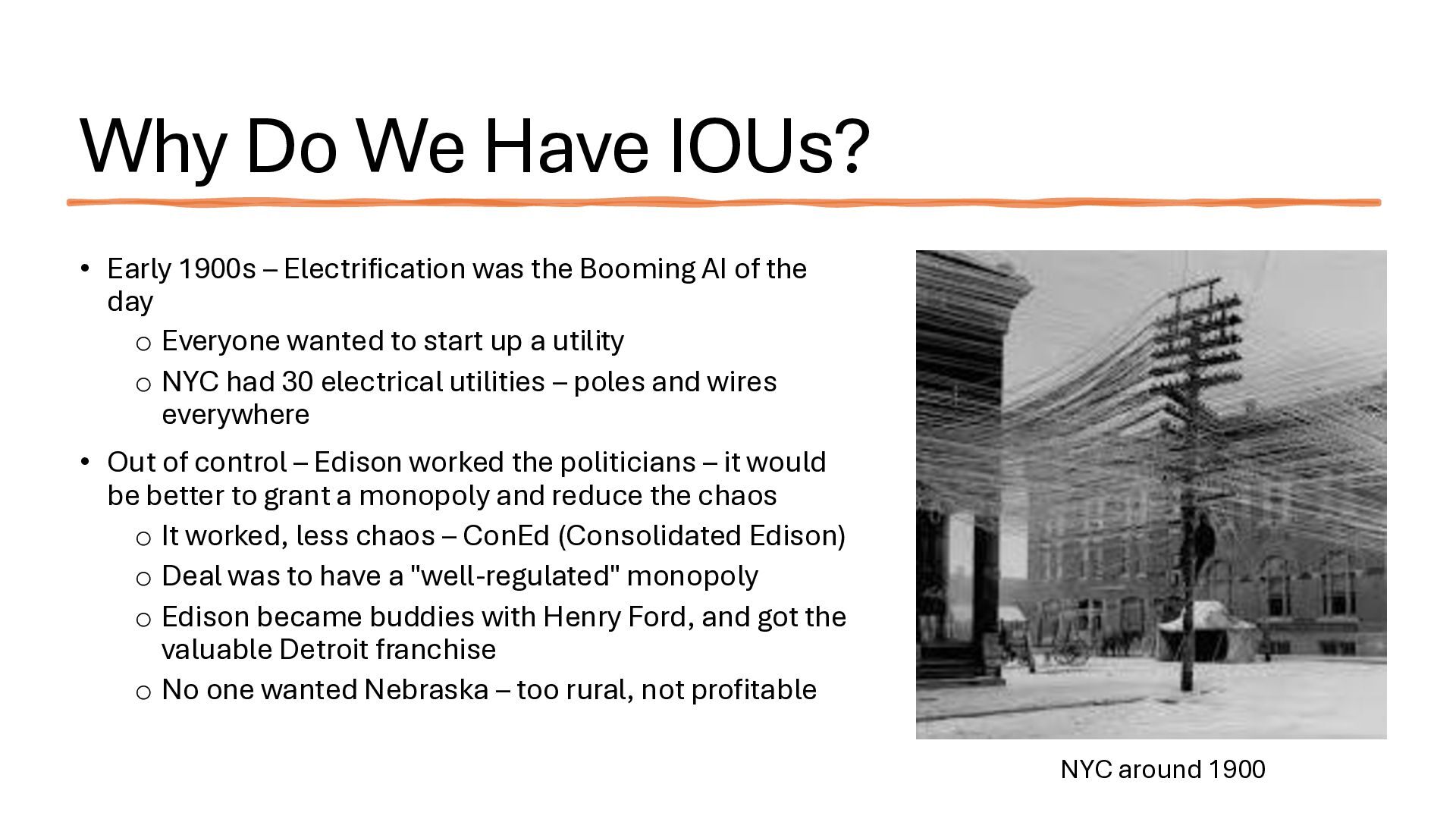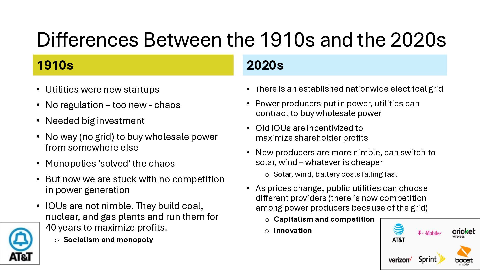new startups • No regulation – too new - chaos • Needed big investment • No way (no grid) to buy wholesale power from somewhere else • Monopolies 'solved' the chaos • But now we are stuck with no competition in power generation • IOUs are not nimble. They build coal, nuclear, and gas plants and run them for 40 years to maximize profits. o Socialism and monopoly • There is an established nationwide electrical grid • Power producers put in power, utilities can contract to buy wholesale power • Old IOUs are incentivized to maximize shareholder profits • New producers are more nimble, can switch to solar, wind – whatever is cheaper o Solar, wind, battery costs falling fast • As prices change, public utilities can choose different providers (there is now competition among power producers because of the grid) o Capitalism and competition o Innovation 1910s 2020s