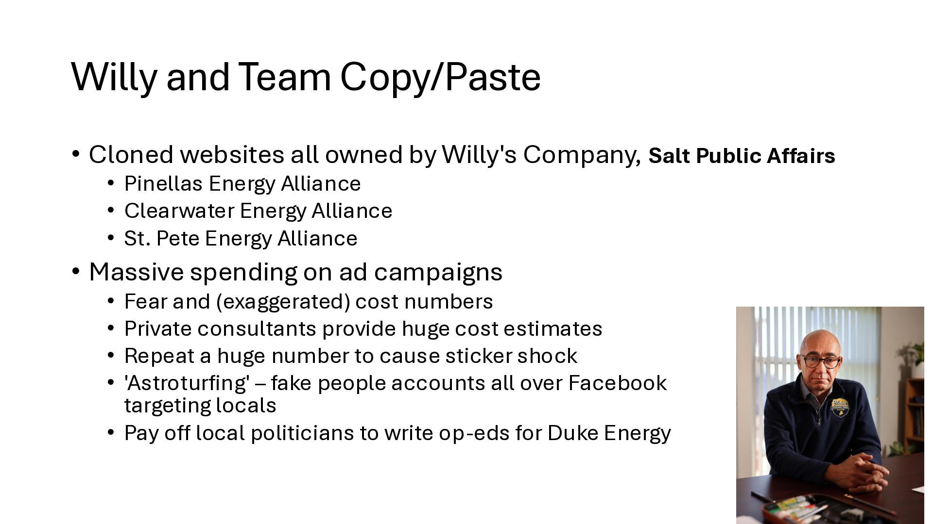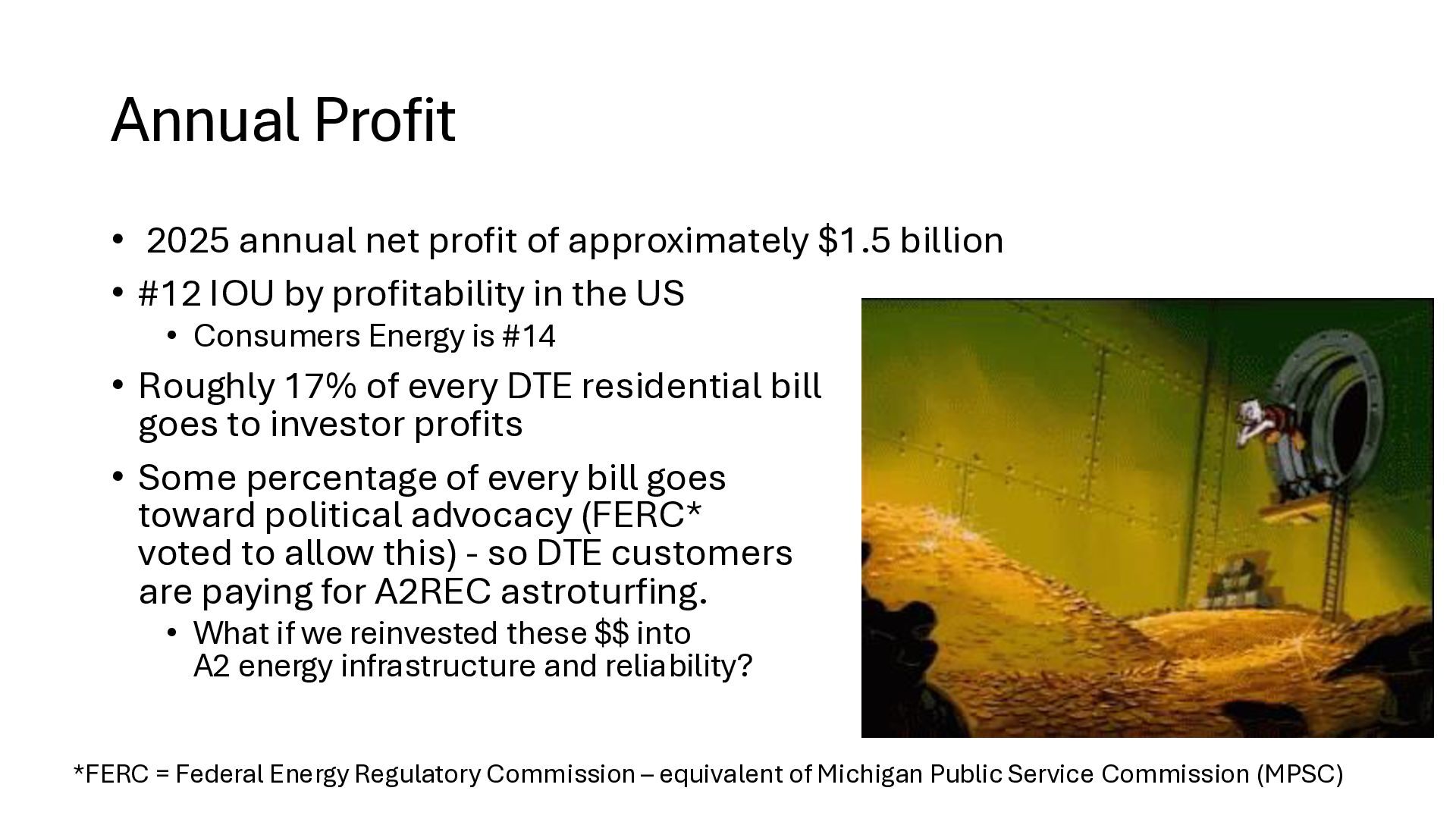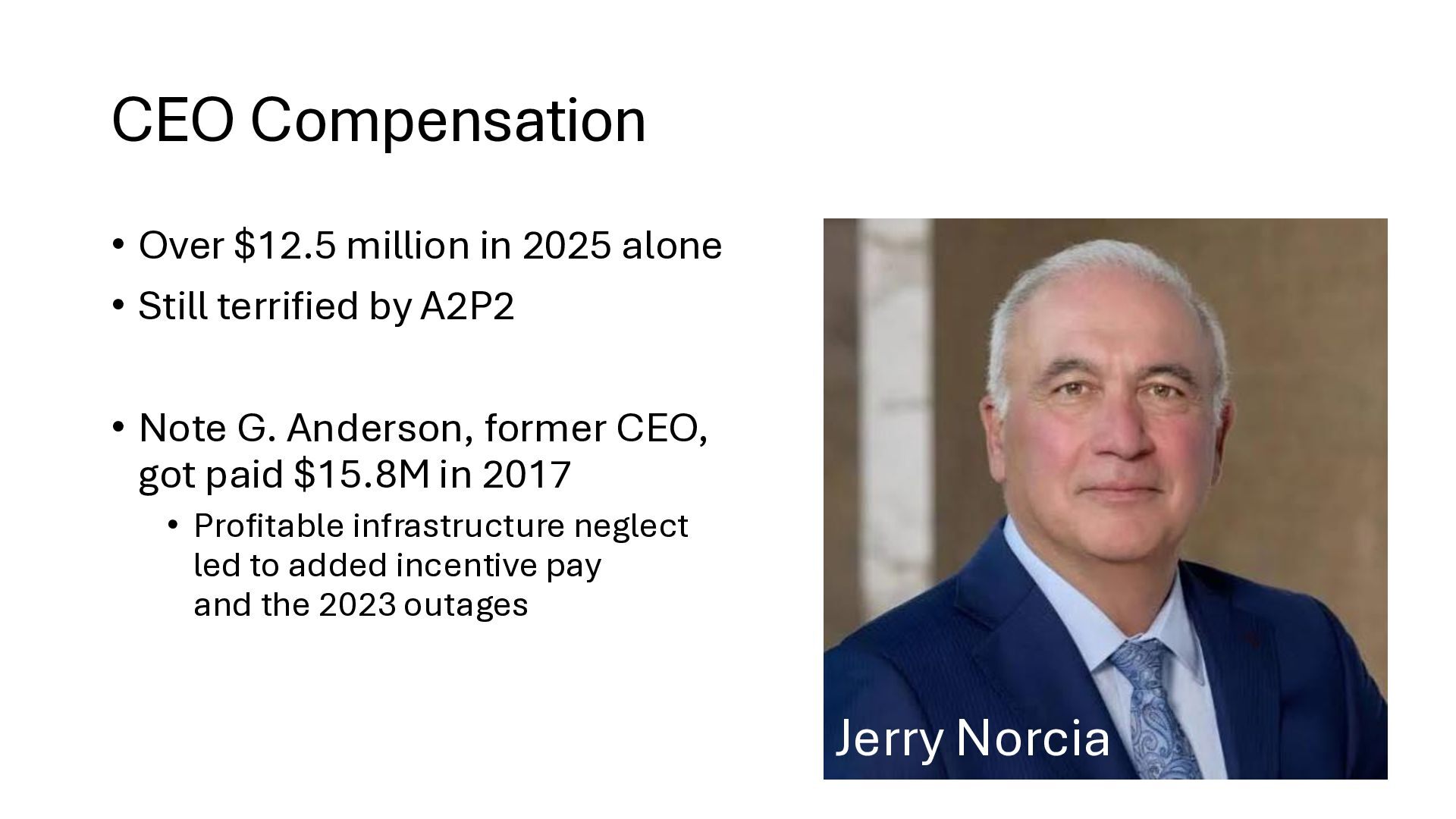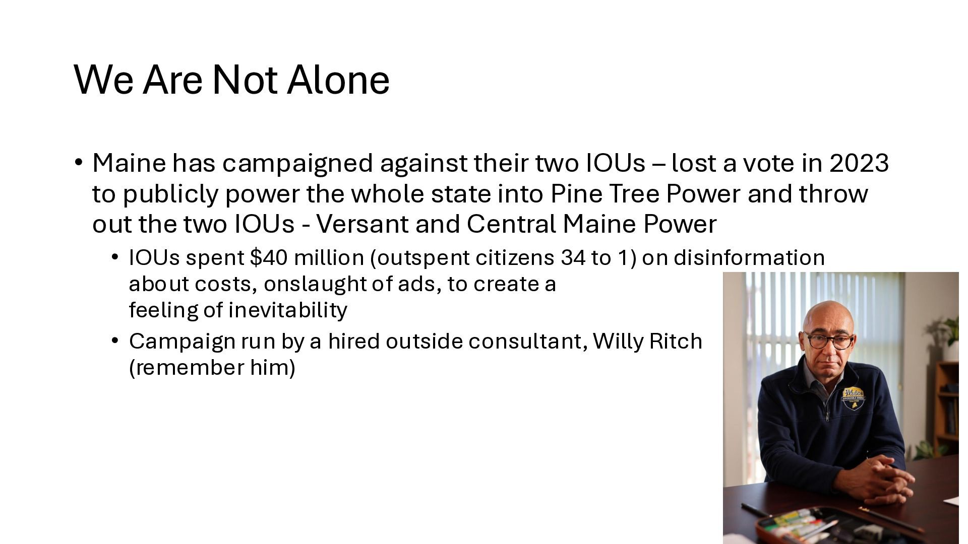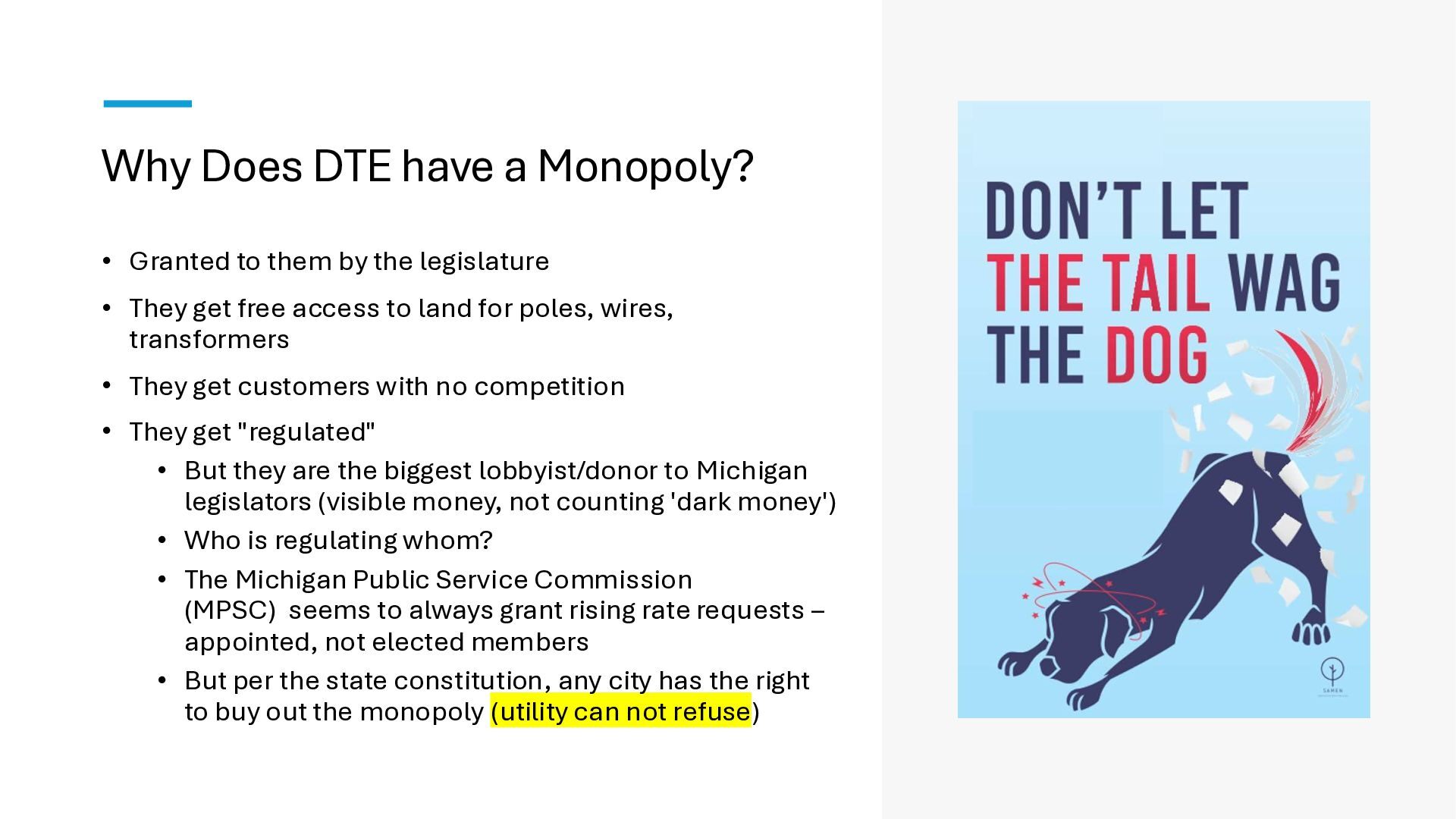 new startups • No regulation – too new - chaos • Needed big investment • No way (no grid) to buy wholesale power from somewhere else • Monopolies 'solved' the chaos • But now we are stuck with no competition in power generation • IOUs are not nimble. They build coal, nuclear, and gas plants and run them for 40 years to maximize profits. o Socialism and monopoly • There is an established nationwide electrical grid • Power producers put in power, utilities can contract to buy wholesale power • Old IOUs are incentivized to maximize shareholder profits • New producers are more nimble, can switch to solar, wind – whatever is cheaper o Solar, wind, battery costs falling fast • As prices change, public utilities can choose different providers (there is now competition among power producers because of the grid) o Capitalism and competition o Innovation 1910s 2020s