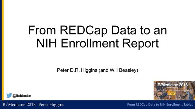 How to go from REDCap clinical trial data to NIH enrollment tables with R. Presented at R/Medicine 2018, resulted in the codified package in collaboration with Will Beasley at OUHSC