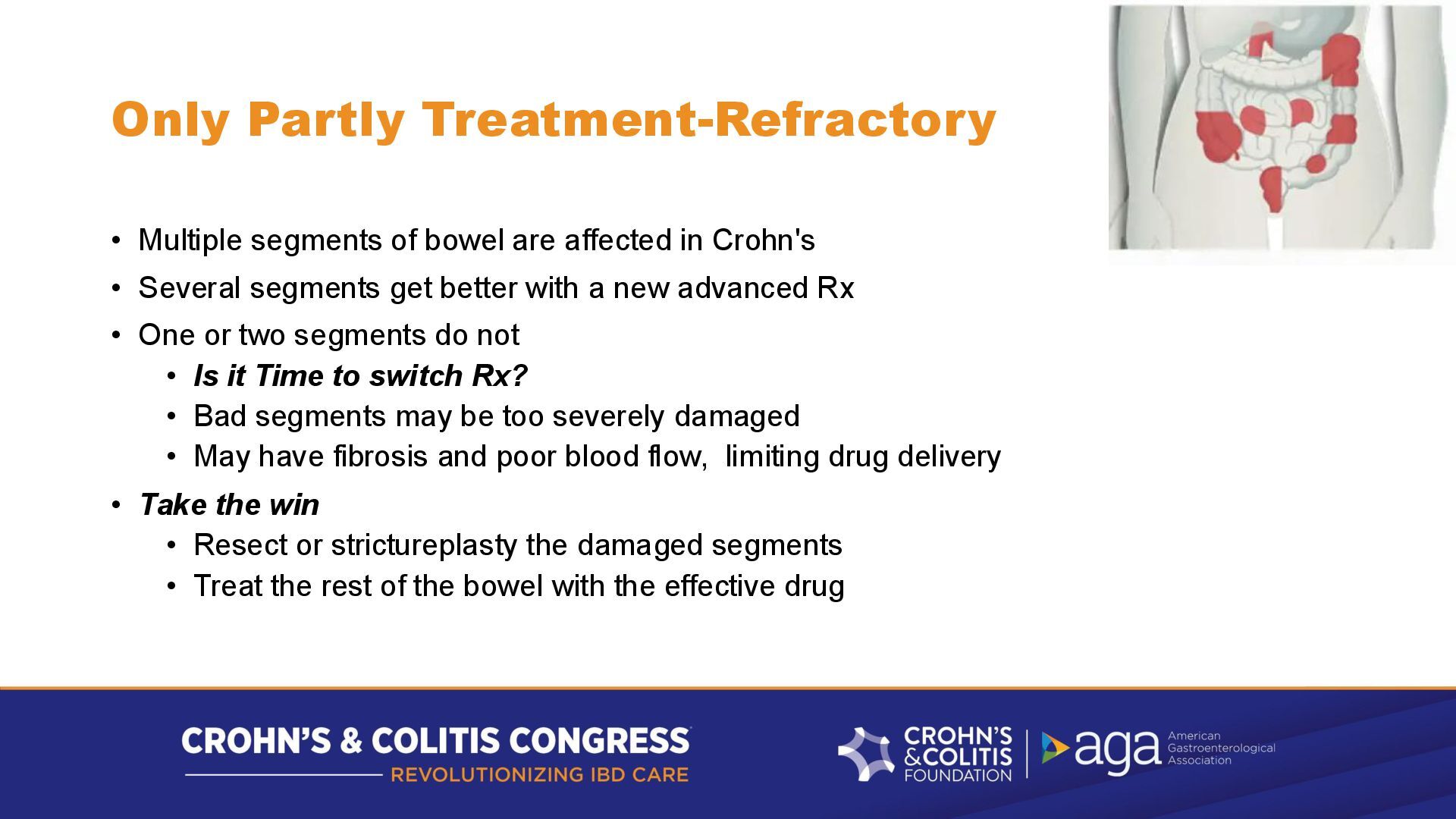 in Crohn's • Several segments get better with a new advanced Rx • One or two segments do not • Is it Time to switch Rx? • Bad segments may be too severely damaged • May have fibrosis and poor blood flow, limiting drug delivery • Take the win • Resect or strictureplasty the damaged segments • Treat the rest of the bowel with the effective drug