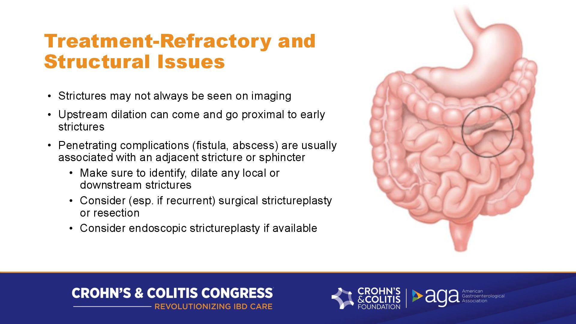 seen on imaging • Upstream dilation can come and go proximal to early strictures • Penetrating complications (fistula, abscess) are usually associated with an adjacent stricture or sphincter • Make sure to identify, dilate any local or downstream strictures • Consider (esp. if recurrent) surgical strictureplasty or resection • Consider endoscopic strictureplasty if available