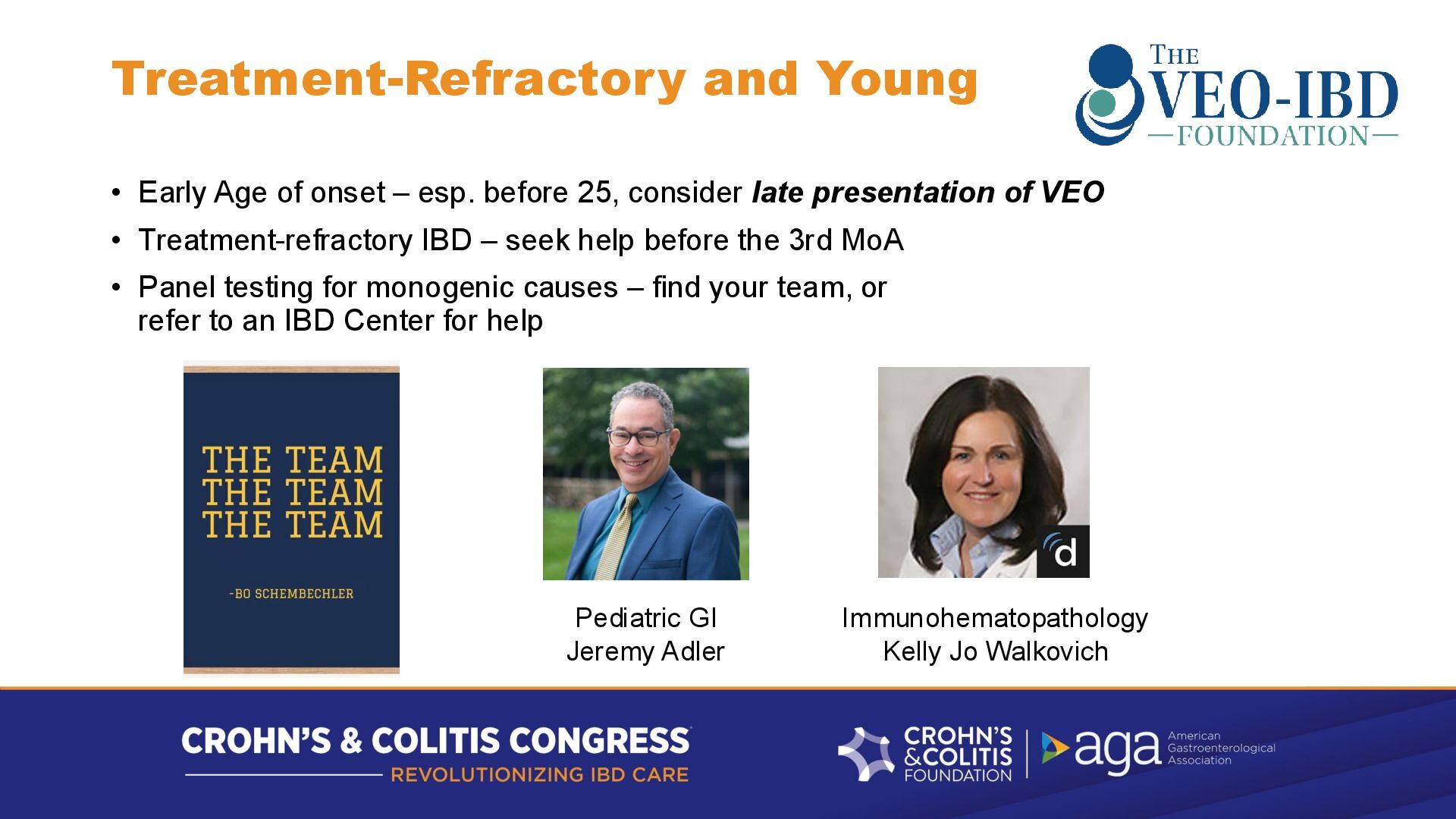 before 25, consider late presentation of VEO • Treatment-refractory IBD – seek help before the 3rd MoA • Panel testing for monogenic causes – find your team, or refer to an IBD Center for help Pediatric GI Jeremy Adler Immunohematopathology Kelly Jo Walkovich