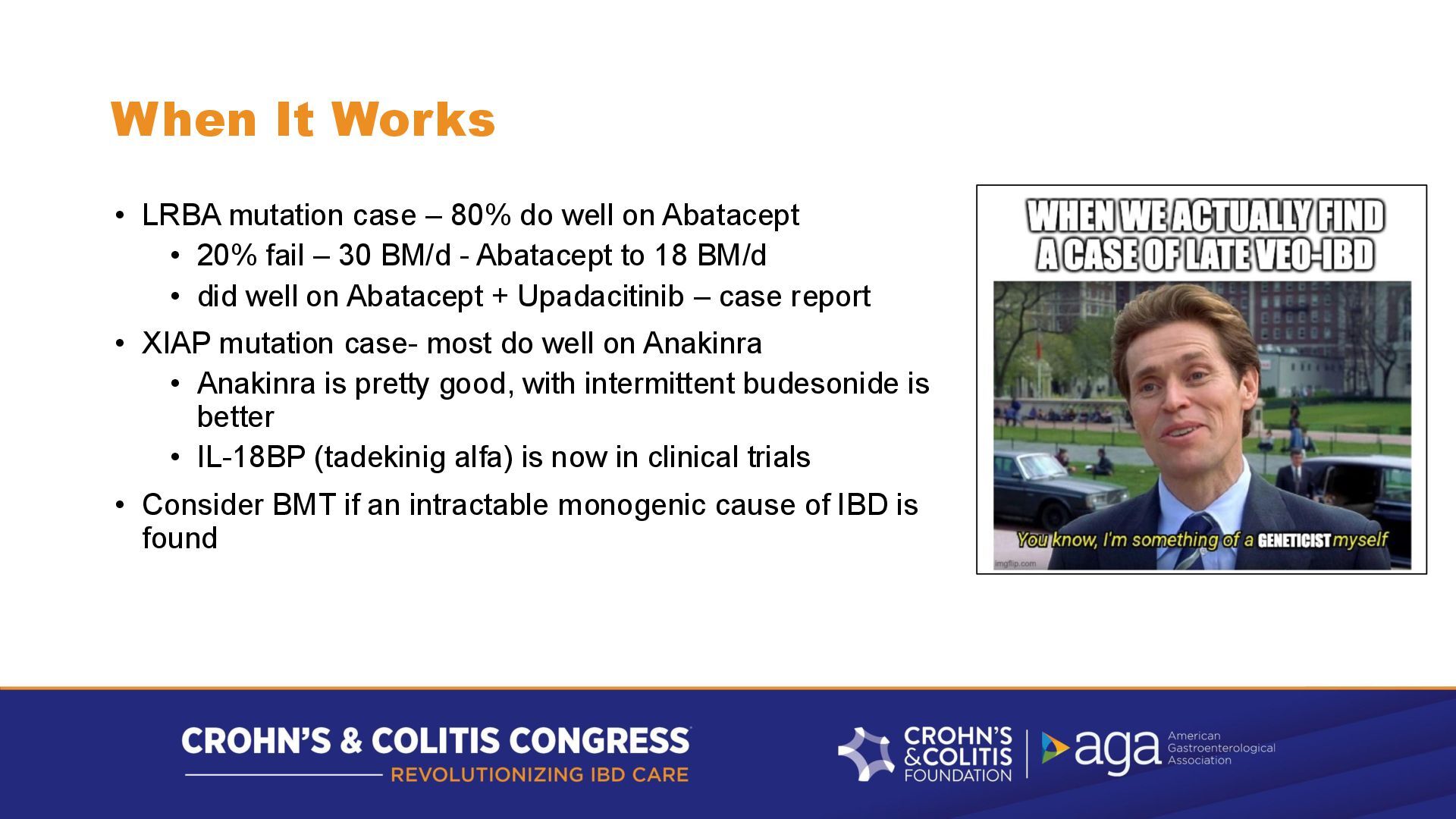 well on Abatacept • 20% fail – 30 BM/d - Abatacept to 18 BM/d • did well on Abatacept + Upadacitinib – case report • XIAP mutation case- most do well on Anakinra • Anakinra is pretty good, with intermittent budesonide is better • IL-18BP (tadekinig alfa) is now in clinical trials • Consider BMT if an intractable monogenic cause of IBD is found