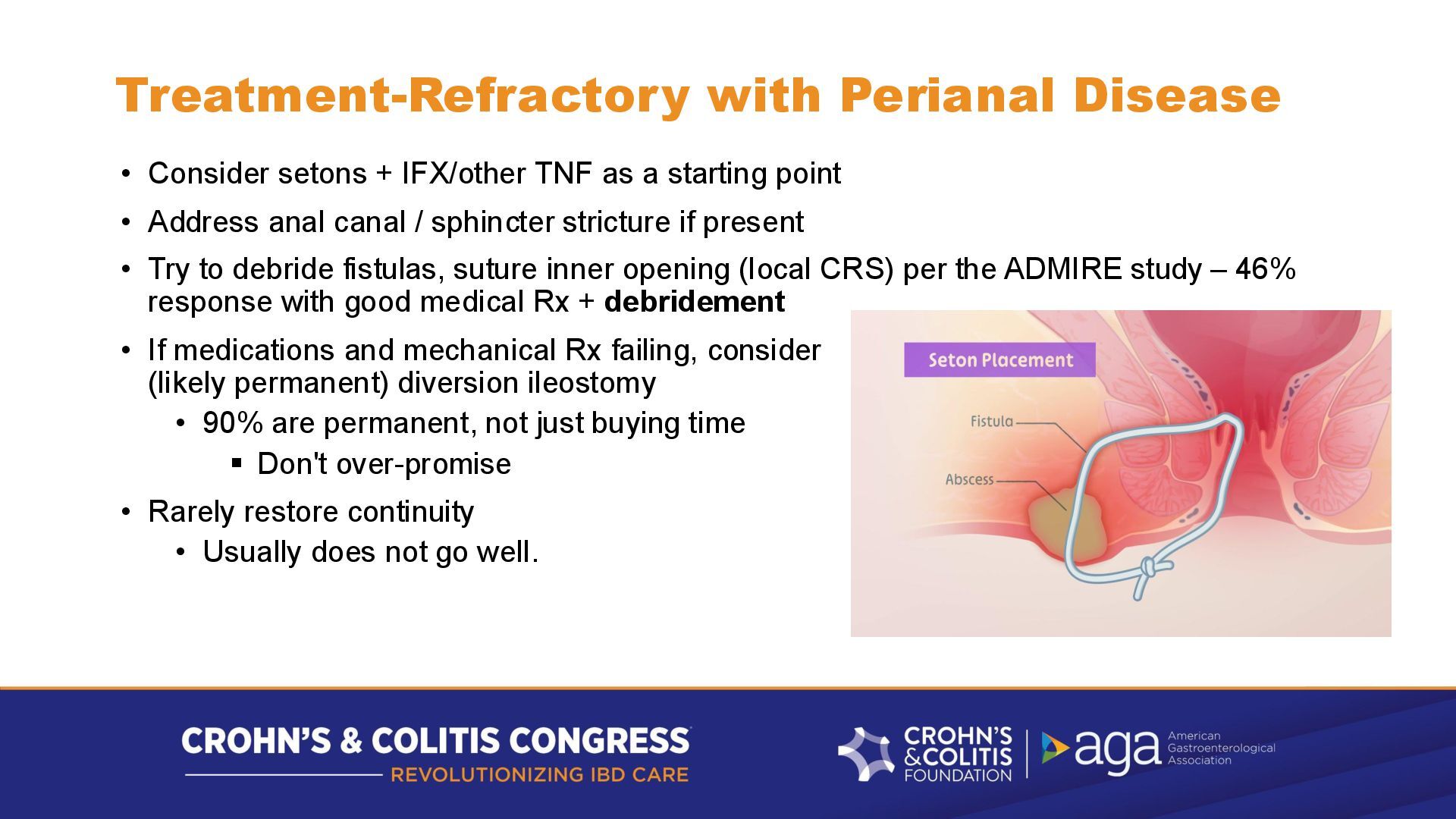 as a starting point • Address anal canal / sphincter stricture if present • Try to debride fistulas, suture inner opening (local CRS) per the ADMIRE study – 46% response with good medical Rx + debridement • If medications and mechanical Rx failing, consider (likely permanent) diversion ileostomy • 90% are permanent, not just buying time ▪ Don't over-promise • Rarely restore continuity • Usually does not go well.