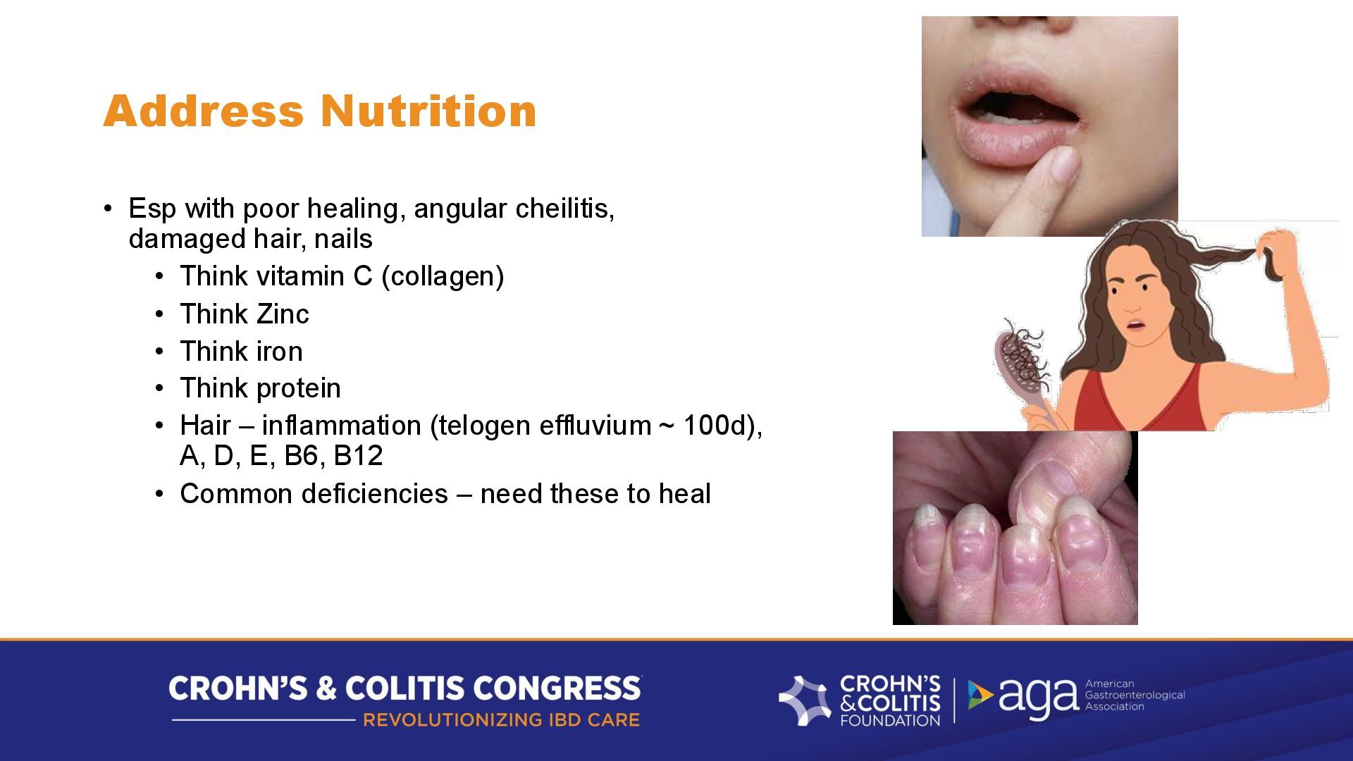 hair, nails • Think vitamin C (collagen) • Think Zinc • Think iron • Think protein • Hair – inflammation (telogen effluvium ~ 100d), A, D, E, B6, B12 • Common deficiencies – need these to heal