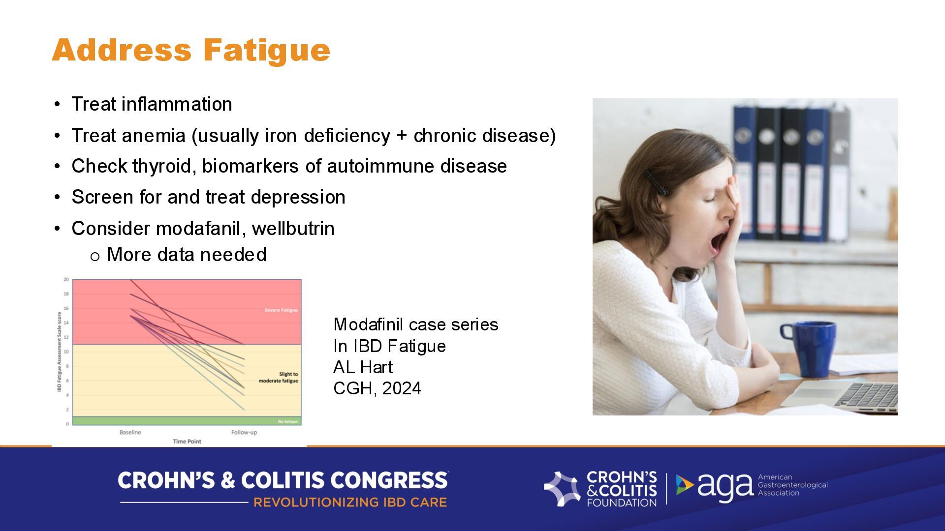 deficiency + chronic disease) • Check thyroid, biomarkers of autoimmune disease • Screen for and treat depression • Consider modafanil, wellbutrin o More data needed Modafinil case series In IBD Fatigue AL Hart CGH, 2024