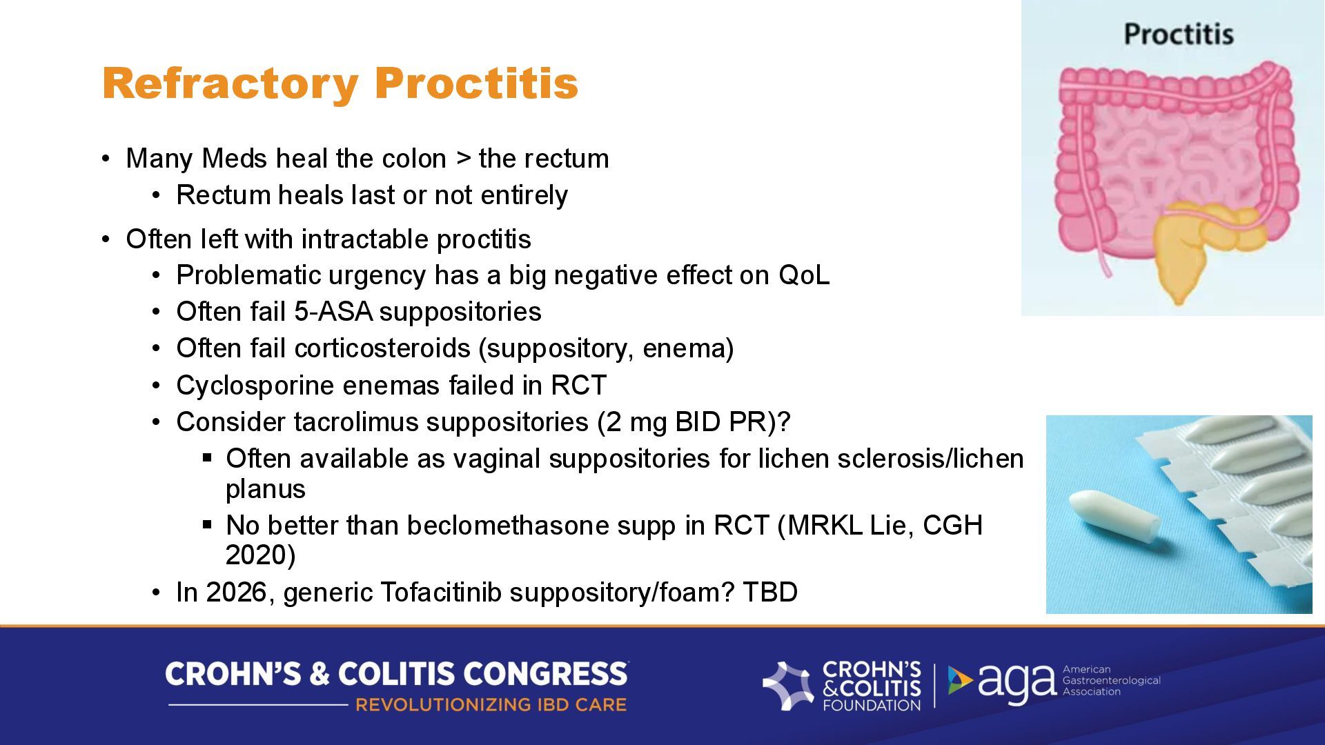 rectum • Rectum heals last or not entirely • Often left with intractable proctitis • Problematic urgency has a big negative effect on QoL • Often fail 5-ASA suppositories • Often fail corticosteroids (suppository, enema) • Cyclosporine enemas failed in RCT • Consider tacrolimus suppositories (2 mg BID PR)? ▪ Often available as vaginal suppositories for lichen sclerosis/lichen planus ▪ No better than beclomethasone supp in RCT (MRKL Lie, CGH 2020) • In 2026, generic Tofacitinib suppository/foam? TBD