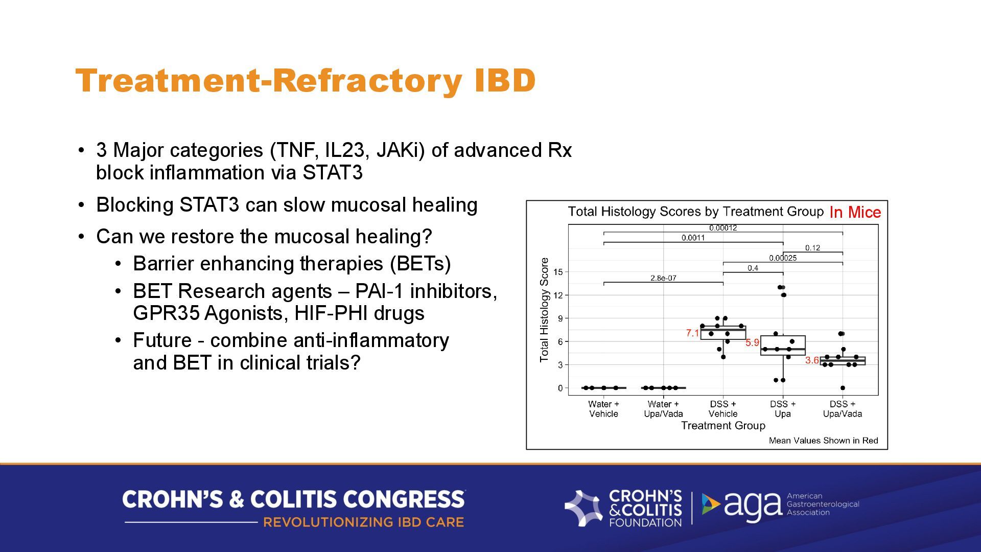 advanced Rx block inflammation via STAT3 • Blocking STAT3 can slow mucosal healing • Can we restore the mucosal healing? • Barrier enhancing therapies (BETs) • BET Research agents – PAI-1 inhibitors, GPR35 Agonists, HIF-PHI drugs • Future - combine anti-inflammatory and BET in clinical trials? In Mice