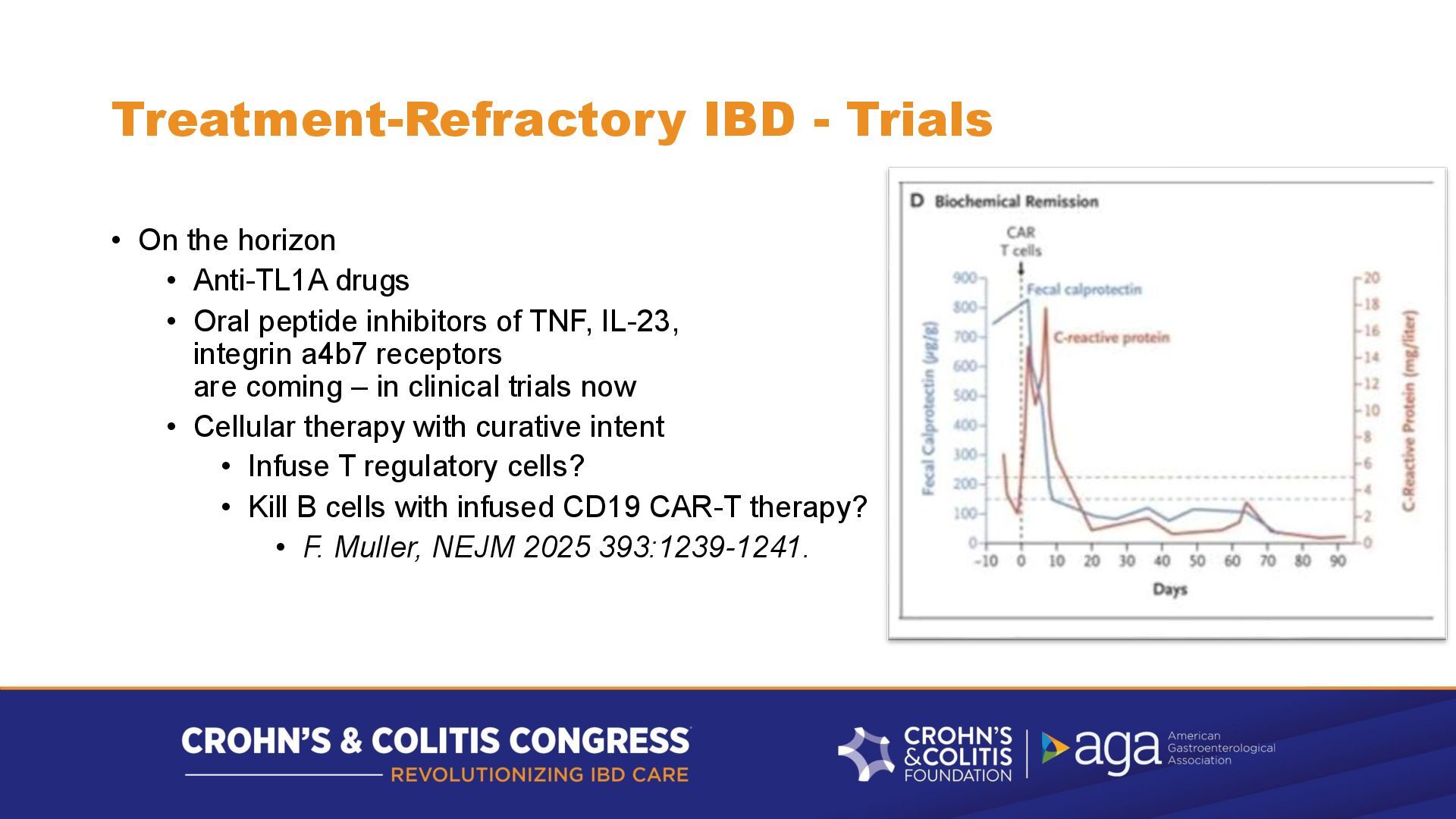 drugs • Oral peptide inhibitors of TNF, IL-23, integrin a4b7 receptors are coming – in clinical trials now • Cellular therapy with curative intent • Infuse T regulatory cells? • Kill B cells with infused CD19 CAR-T therapy? • F. Muller, NEJM 2025 393:1239-1241.