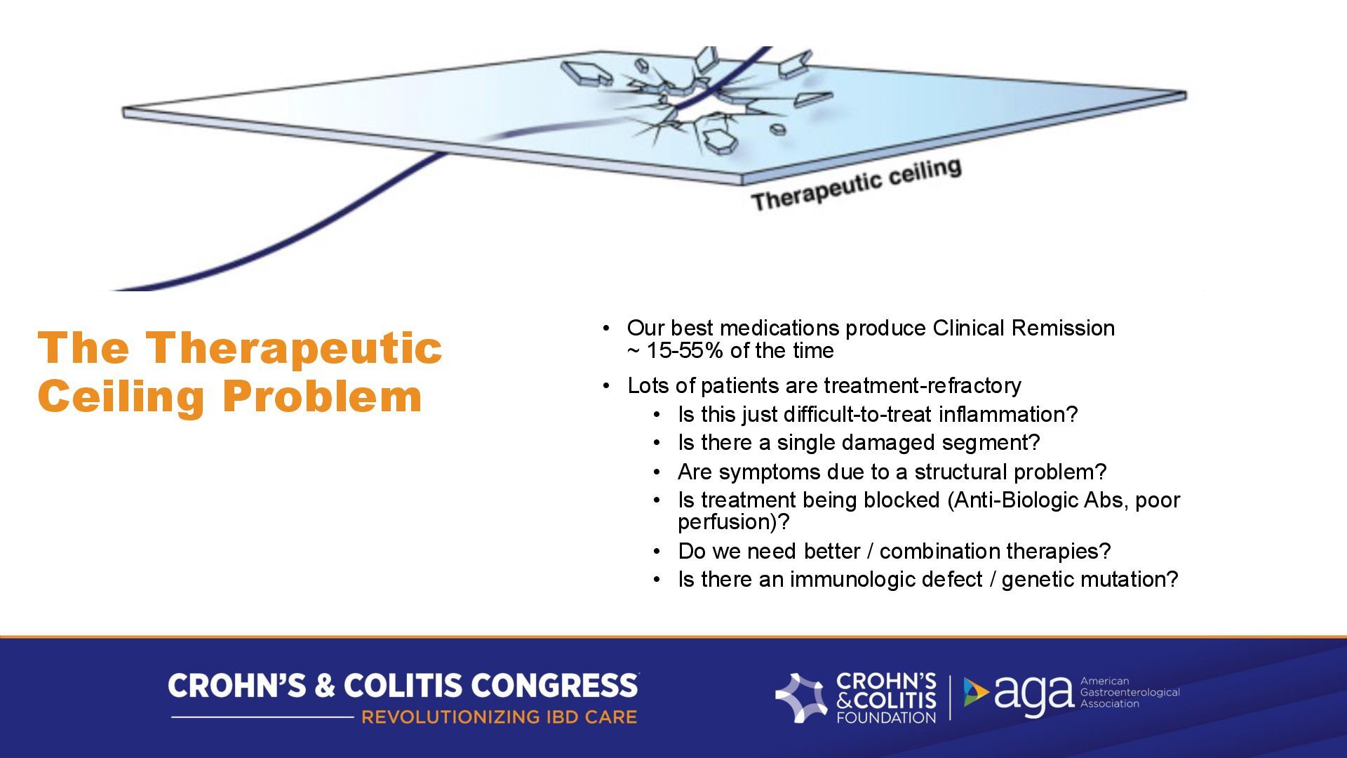 Remission ~ 15-55% of the time • Lots of patients are treatment-refractory • Is this just difficult-to-treat inflammation? • Is there a single damaged segment? • Are symptoms due to a structural problem? • Is treatment being blocked (Anti-Biologic Abs, poor perfusion)? • Do we need better / combination therapies? • Is there an immunologic defect / genetic mutation?