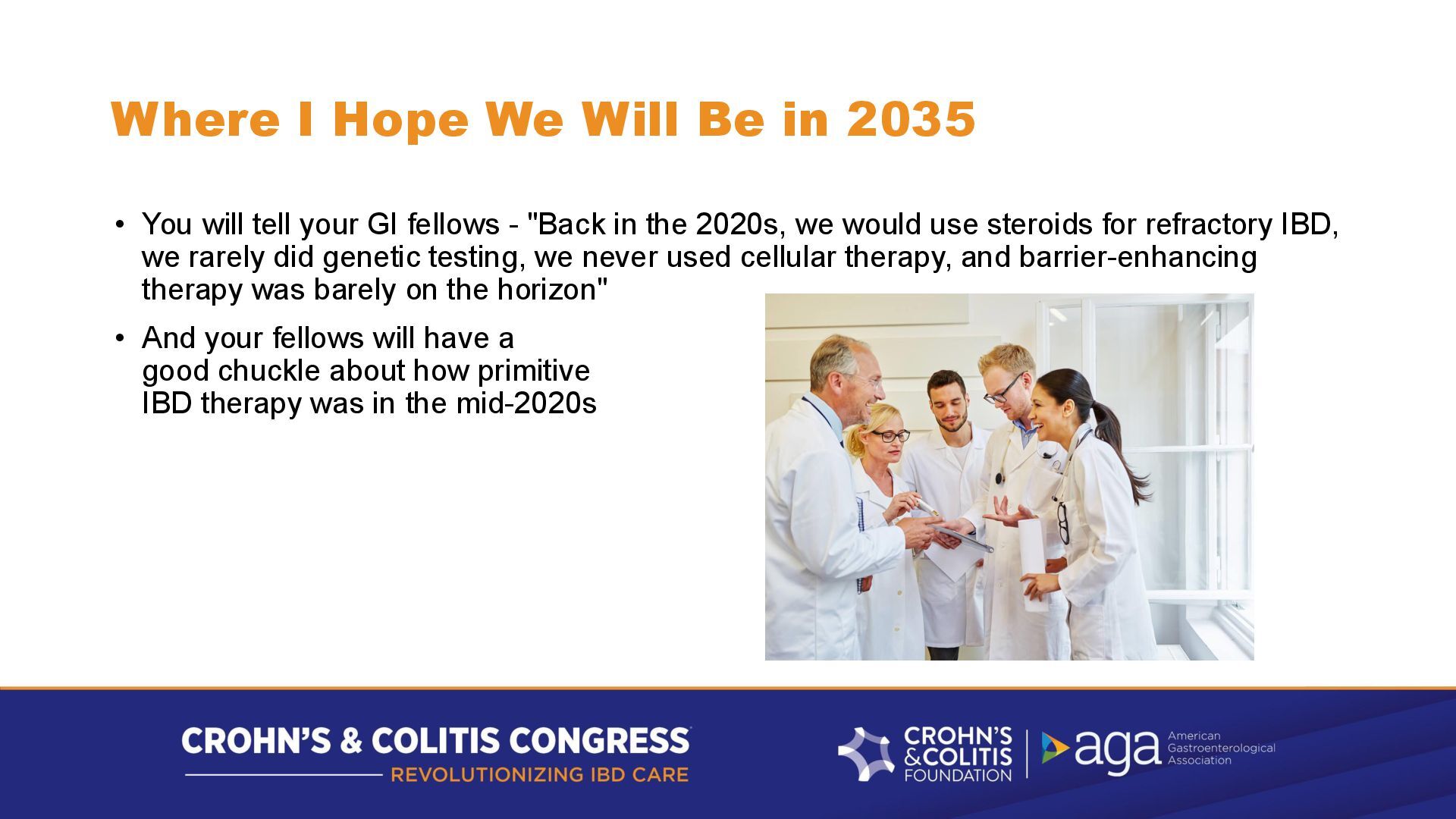 will tell your GI fellows - "Back in the 2020s, we would use steroids for refractory IBD, we rarely did genetic testing, we never used cellular therapy, and barrier-enhancing therapy was barely on the horizon" • And your fellows will have a good chuckle about how primitive IBD therapy was in the mid-2020s