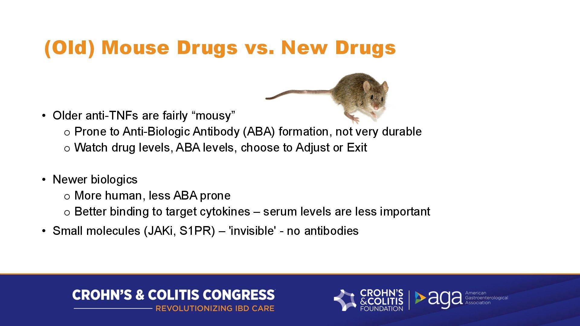 fairly “mousy” o Prone to Anti-Biologic Antibody (ABA) formation, not very durable o Watch drug levels, ABA levels, choose to Adjust or Exit • Newer biologics o More human, less ABA prone o Better binding to target cytokines – serum levels are less important • Small molecules (JAKi, S1PR) – 'invisible' - no antibodies