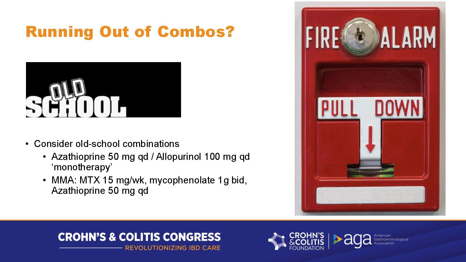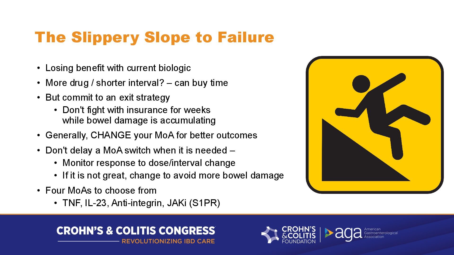 biologic • More drug / shorter interval? – can buy time • But commit to an exit strategy • Don't fight with insurance for weeks while bowel damage is accumulating • Generally, CHANGE your MoA for better outcomes • Don't delay a MoA switch when it is needed – • Monitor response to dose/interval change • If it is not great, change to avoid more bowel damage • Four MoAs to choose from • TNF, IL-23, Anti-integrin, JAKi (S1PR)