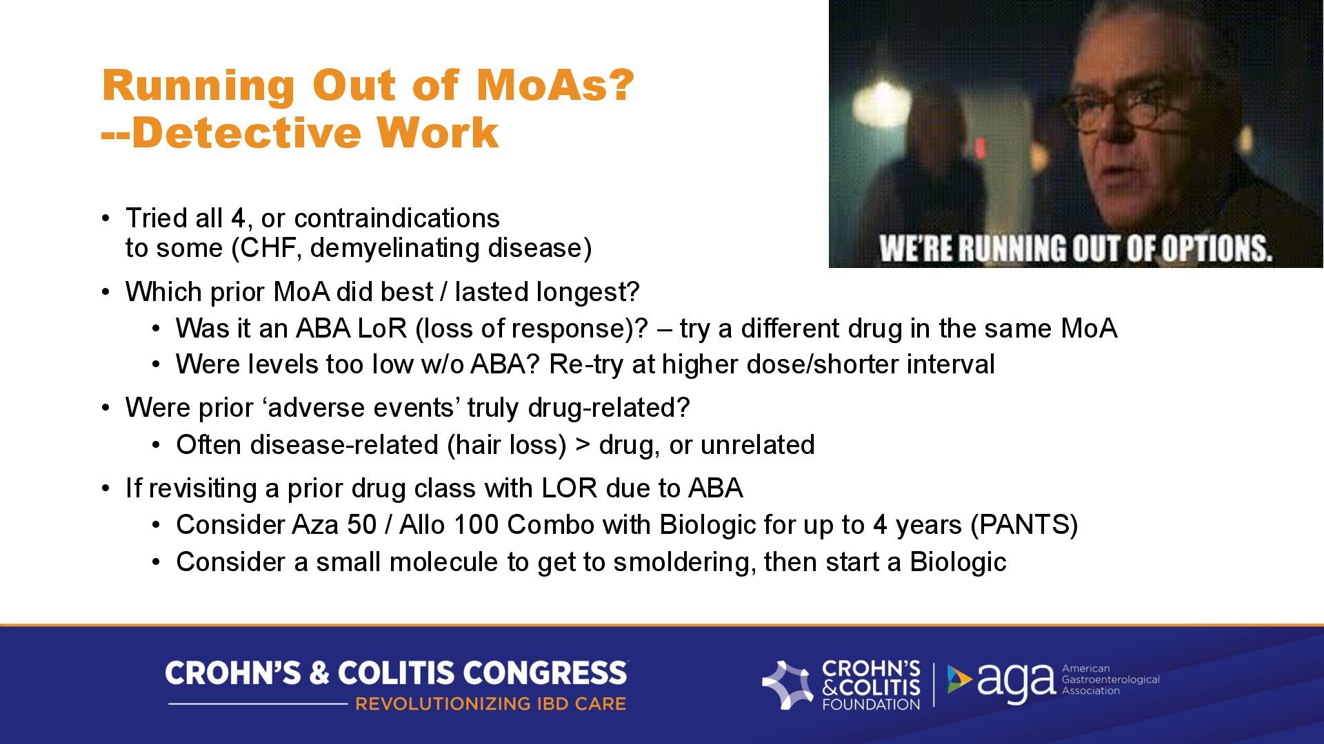 or contraindications to some (CHF, demyelinating disease) • Which prior MoA did best / lasted longest? • Was it an ABA LoR (loss of response)? – try a different drug in the same MoA • Were levels too low w/o ABA? Re-try at higher dose/shorter interval • Were prior ‘adverse events’ truly drug-related? • Often disease-related (hair loss) > drug, or unrelated • If revisiting a prior drug class with LOR due to ABA • Consider Aza 50 / Allo 100 Combo with Biologic for up to 4 years (PANTS) • Consider a small molecule to get to smoldering, then start a Biologic