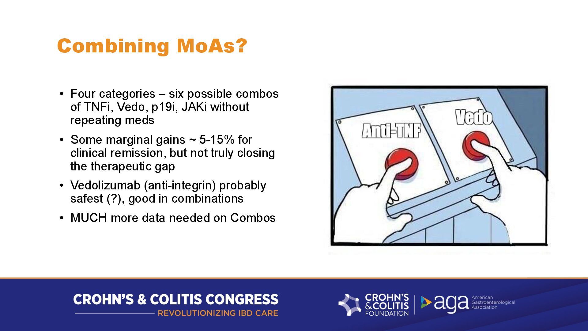 TNFi, Vedo, p19i, JAKi without repeating meds • Some marginal gains ~ 5-15% for clinical remission, but not truly closing the therapeutic gap • Vedolizumab (anti-integrin) probably safest (?), good in combinations • MUCH more data needed on Combos