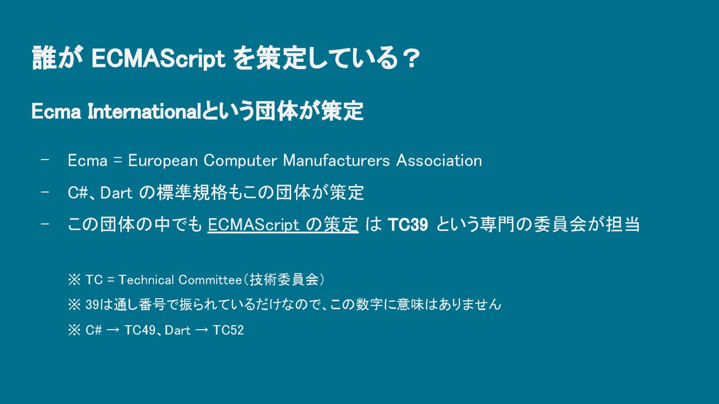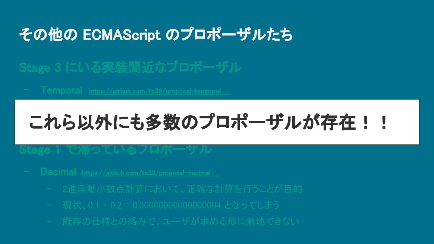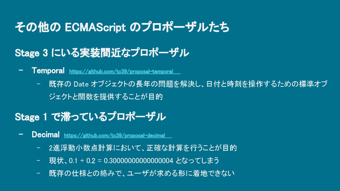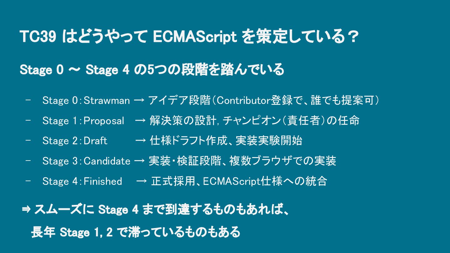 - Stage 4:Finished → 正式採用、ECMAScript仕様への統合