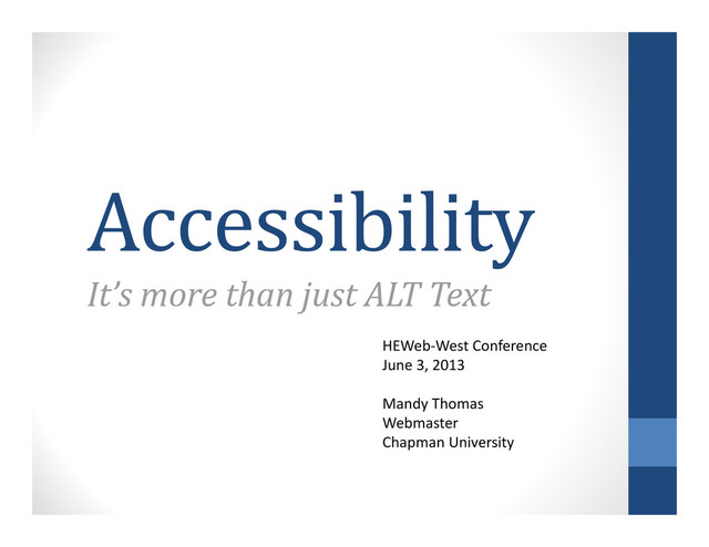 This session will give you not only a brief overview of what accessibility on a website means, but also some working examples of HTML coding and other techniques that will fix some of the most common issues. Examples will be provided on forms, document structure, color contrasts, tables, images, video, pdf’s and more. If you are overwhelmed by the standards websites on WCAG and section 508 guidelines, this session will give a summary of those and provide you with resources, both free and in the marketplace, for detecting and fixing issues on your own website. Through a recent ground-up redesign of her university’s website, Mandy and the web team have learned a lot about accessibility and continue to try to understand this complex field and make adjustments to better serve all audiences. She will share what they have learned.