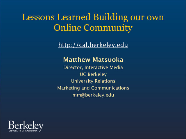 Matthew will talk about why the UC Berkeley team decided to leave their vendor platform and how they built their online community from scratch with only internal resources. He will discuss the outcomes and challenges and how UC Berkeley is positioned for the future, given the constantly changing landscape of vendors and social media sites.