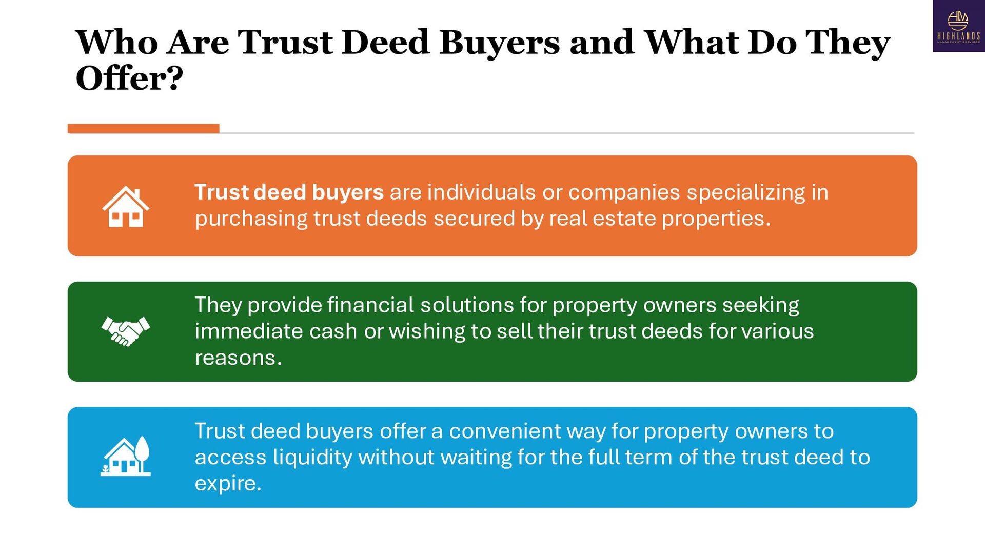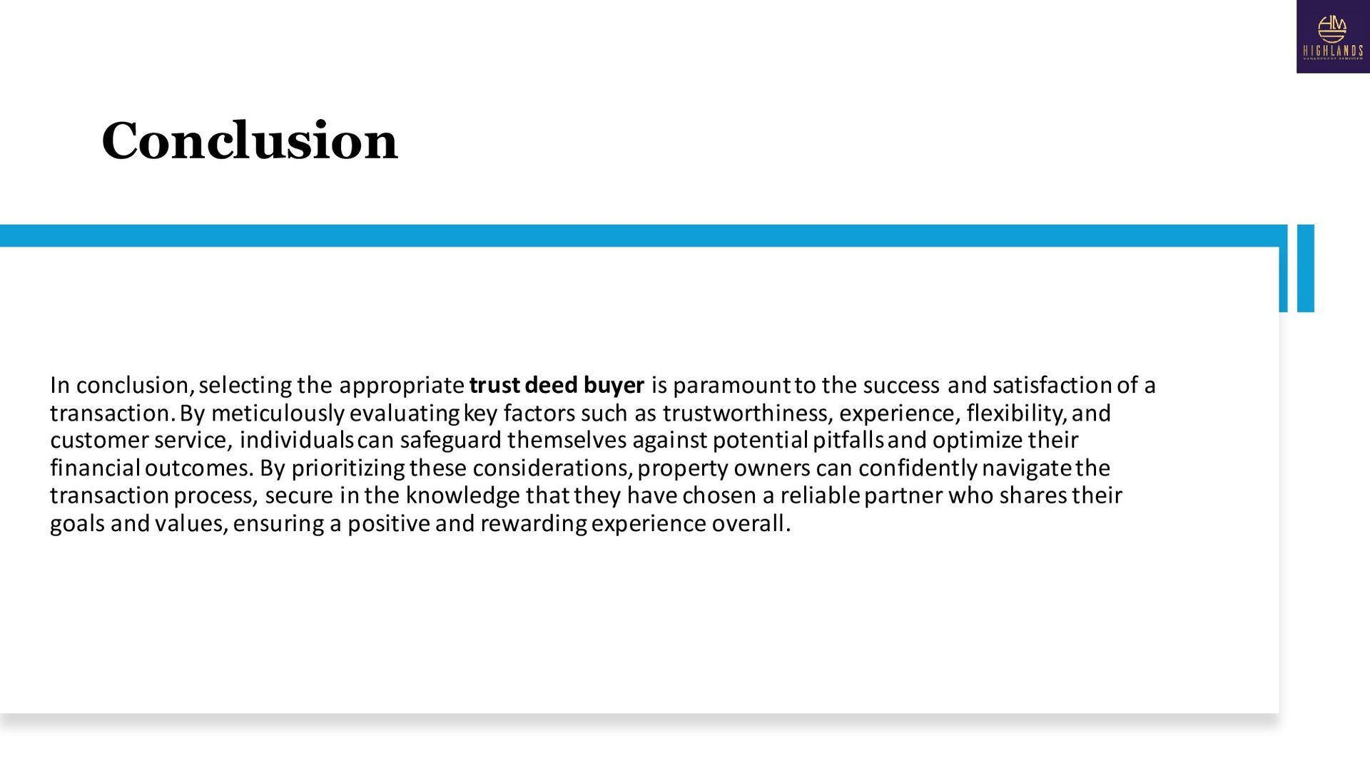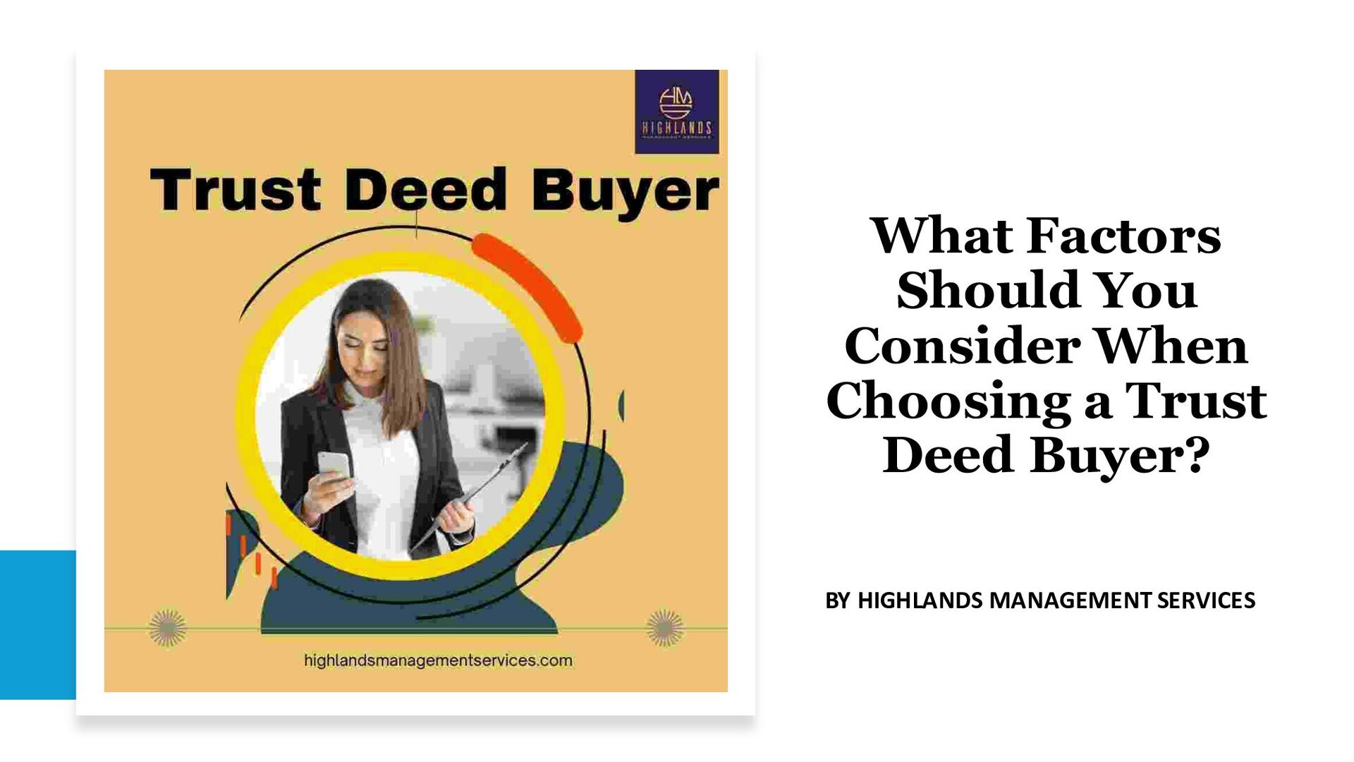 When selecting a trust deed buyer, consider their reputation, experience, and track record. Assess their responsiveness, transparency, and communication style. Review their terms, fees, and timeline for closing. Verify their licensing, accreditation, and client testimonials. Compare multiple offers to ensure you're getting the best deal. Ultimately, prioritize trustworthiness and reliability for a smooth transaction. Visit https://highlandsmanagementservices.com/consumer-services/