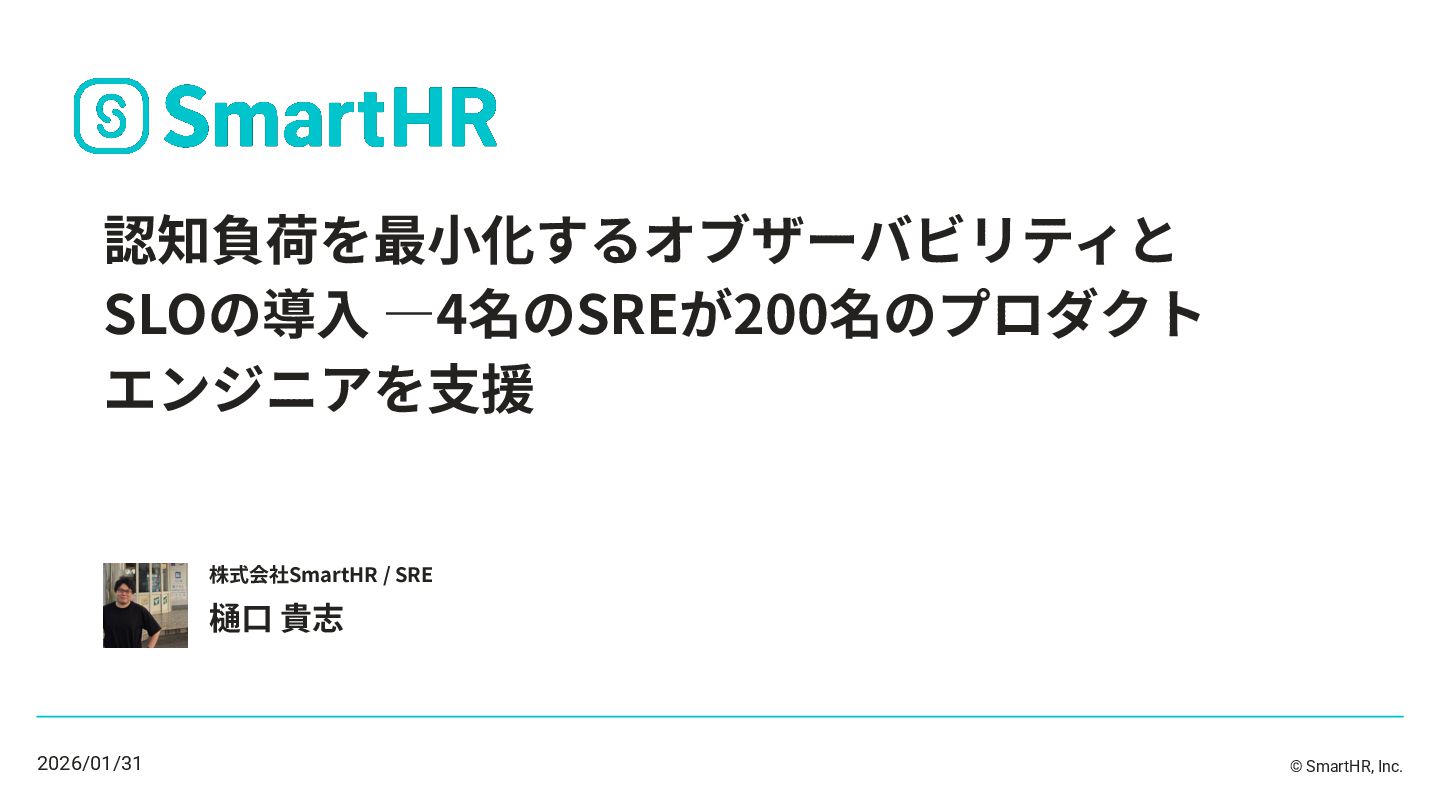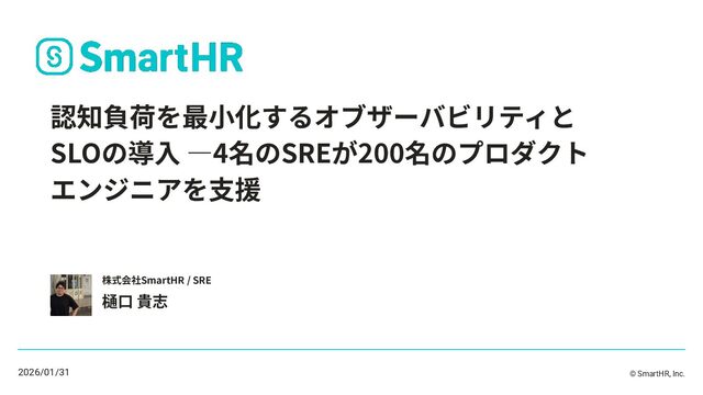 © SmartHR, Inc. 認知負荷を最⼩化するオブザーバビリティと SLOの導⼊ ―4名のSREが200名のプロダクト エンジニアを⽀援 樋⼝ 貴志 株式会社SmartHR