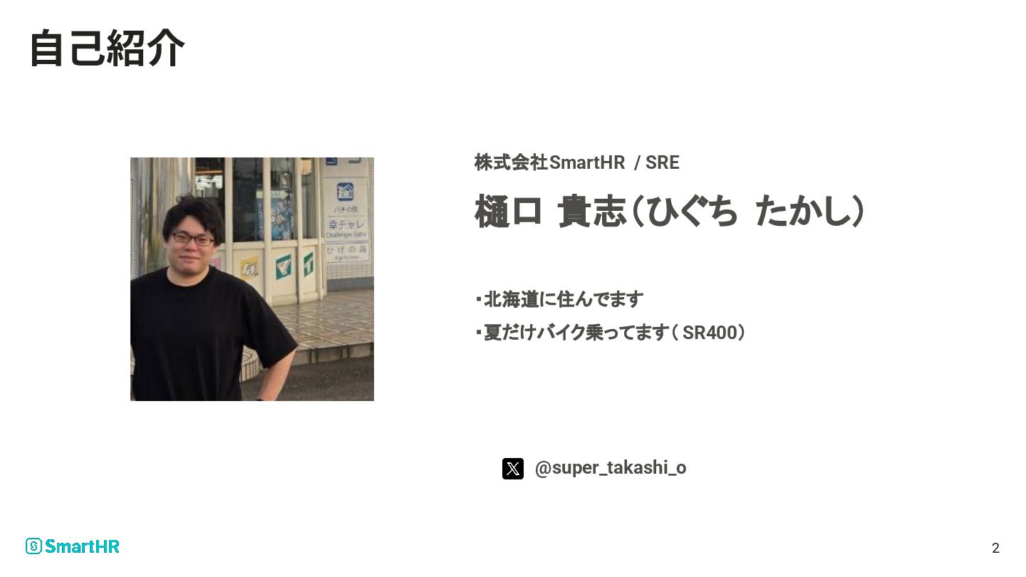 樋口 貴志(ひぐち たかし) 株式会社SmartHR / SRE ・北海道に住んでます ・夏だけバイク乗ってます( SR400) @super_takashi_o