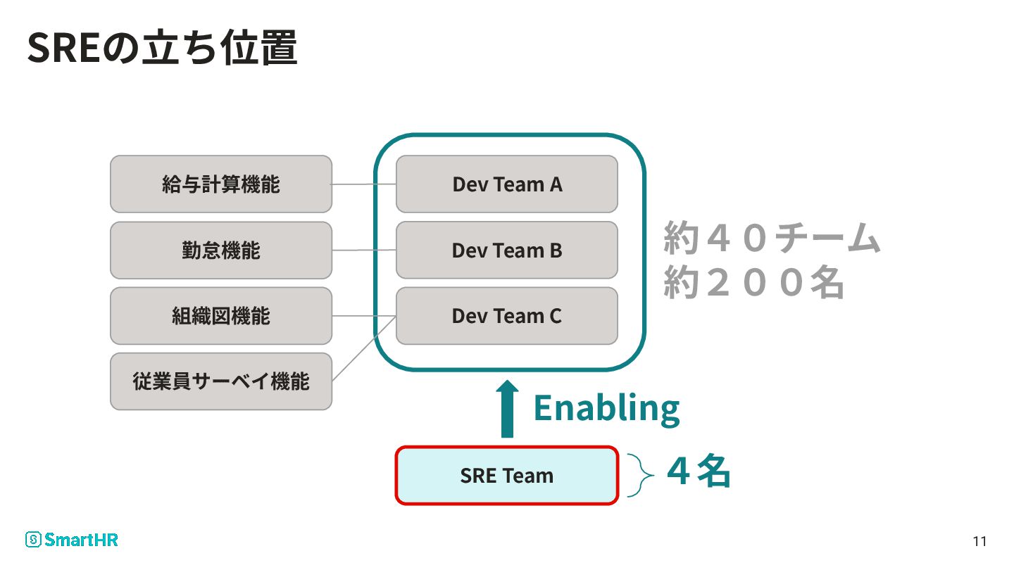 Team C 従業員サーベイ機能 SRE Team 4名 Enabling 11 約40チーム 約200名 SREの⽴ち位置