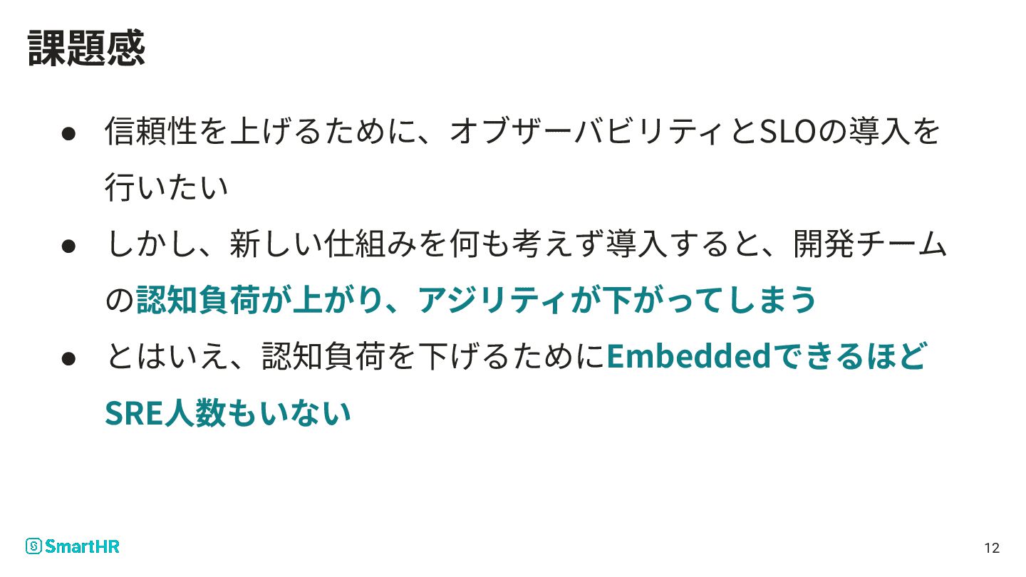 12 • 信頼性を上げるために、オブザーバビリティとSLOの導⼊を ⾏いたい • しかし、新しい仕組みを何も考えず導⼊すると、開発チーム の認知負荷が上がり、アジリティが下がってしまう • とはいえ、認知負荷を下げるためにEmbeddedできるほど SRE⼈数もいない
