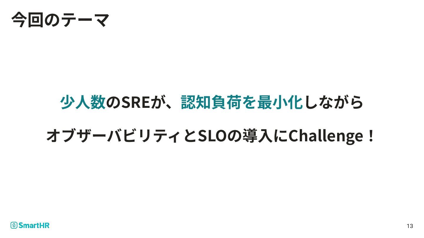 少⼈数のSREが、認知負荷を最⼩化しながら オブザーバビリティとSLOの導⼊にChallenge! 13 今回のテーマ