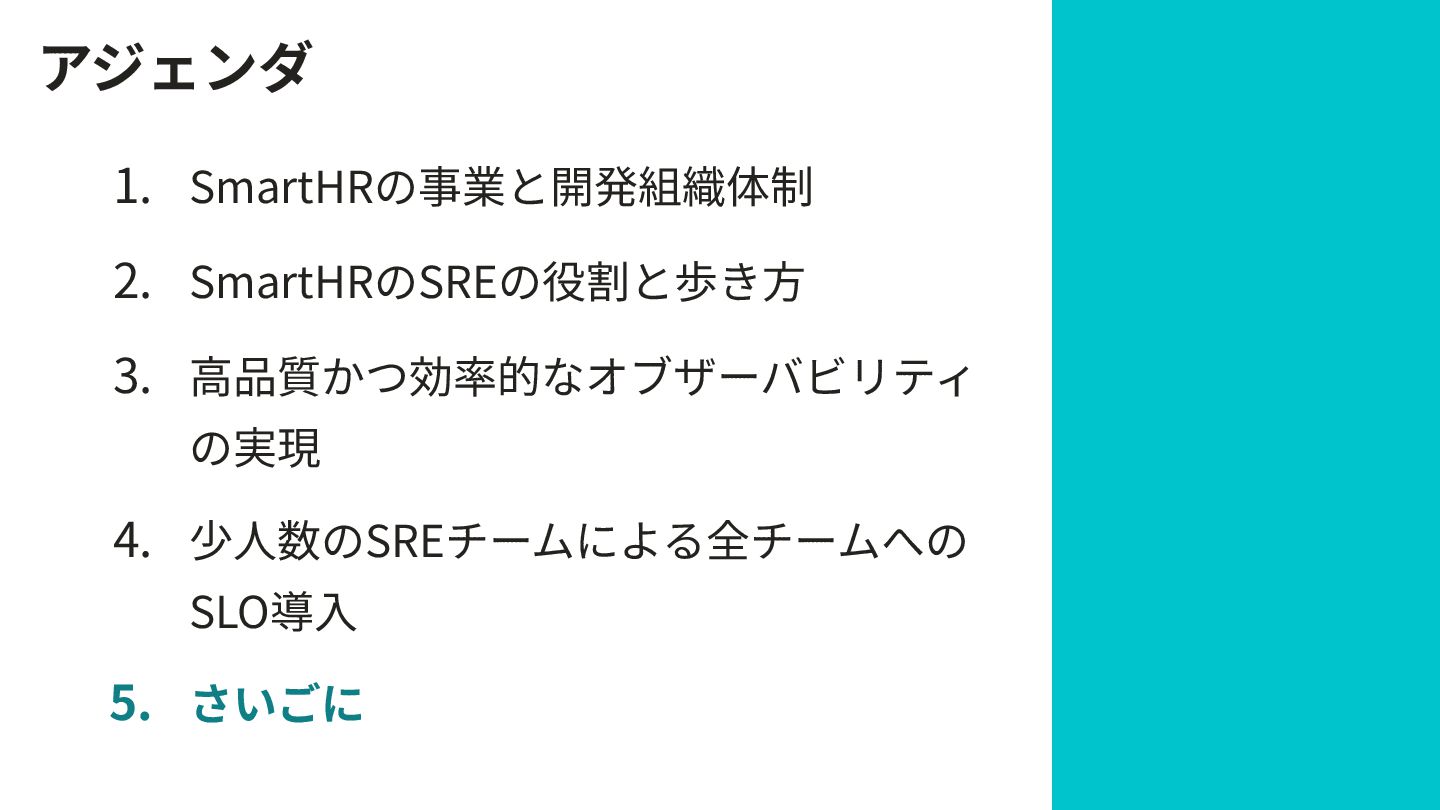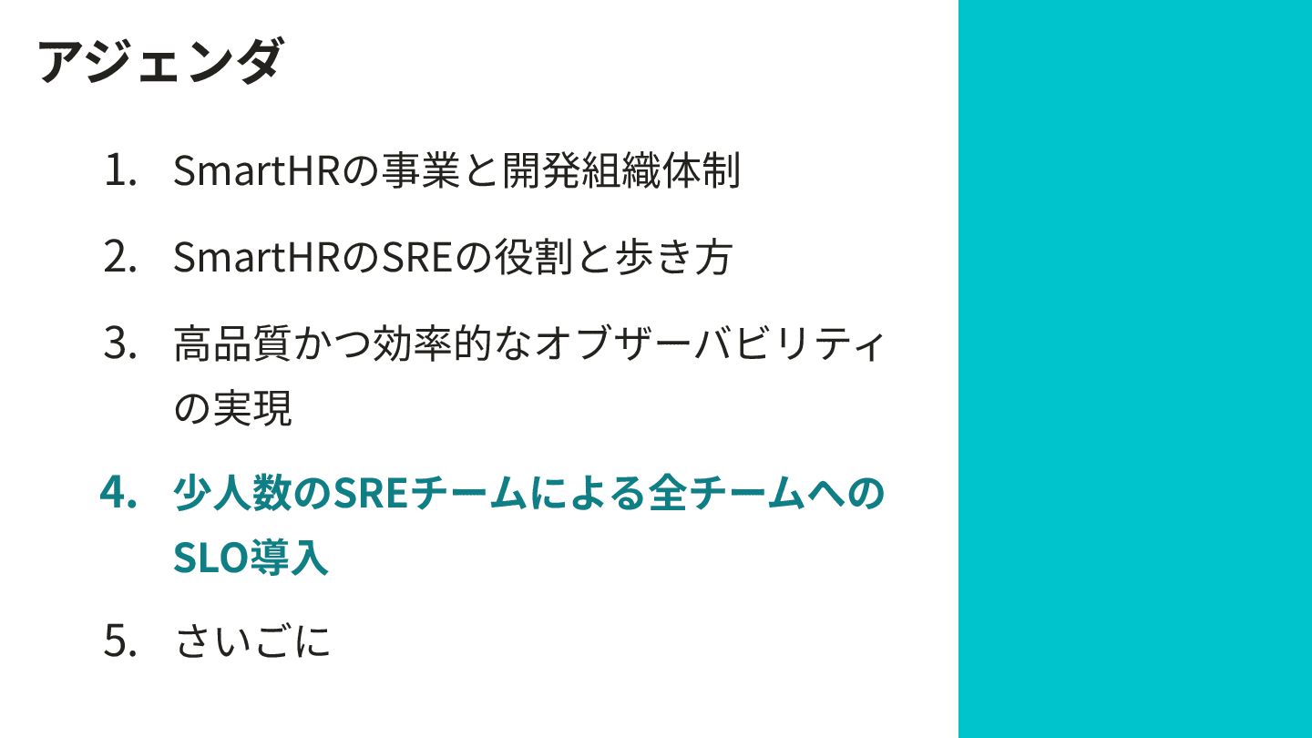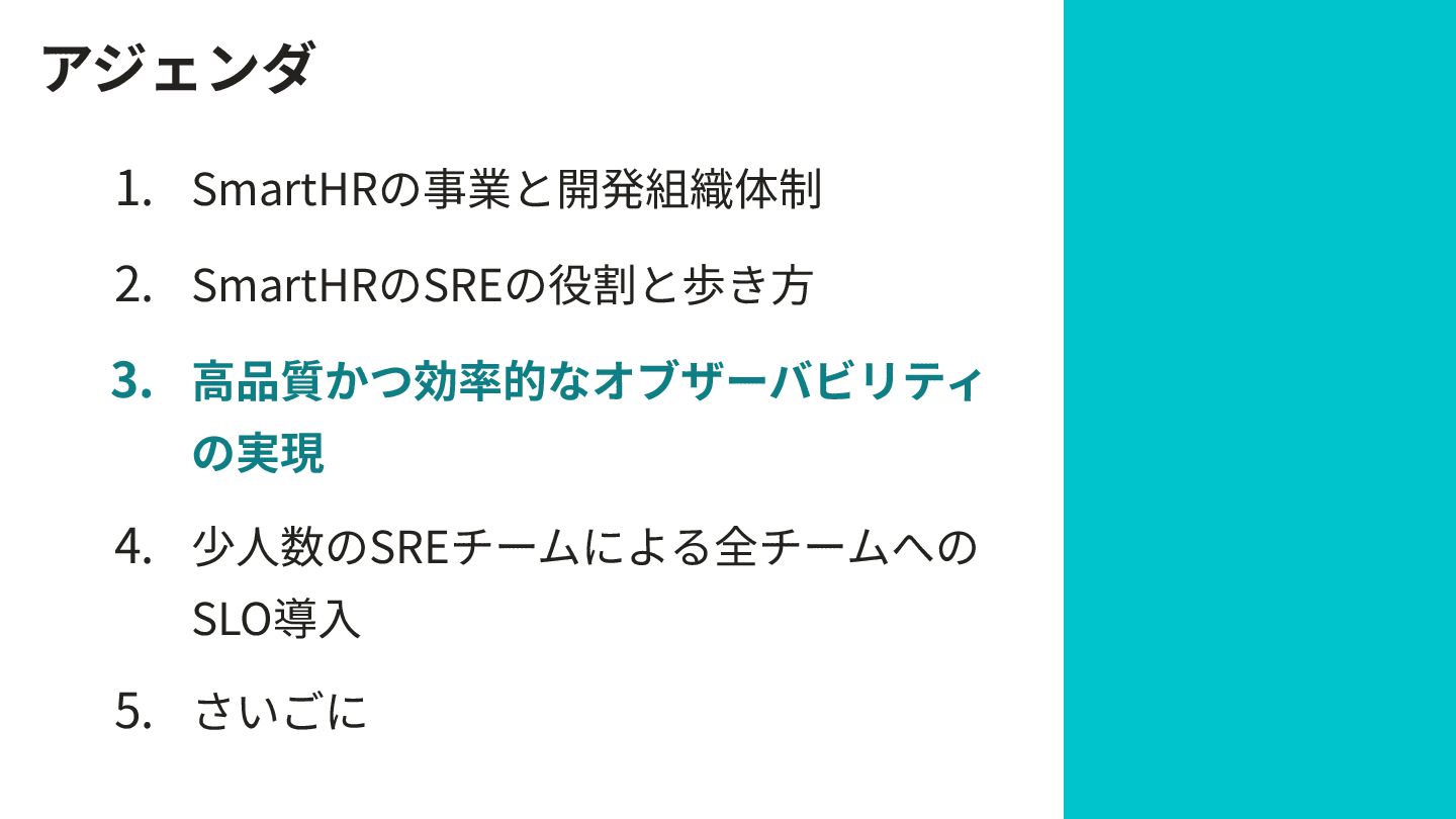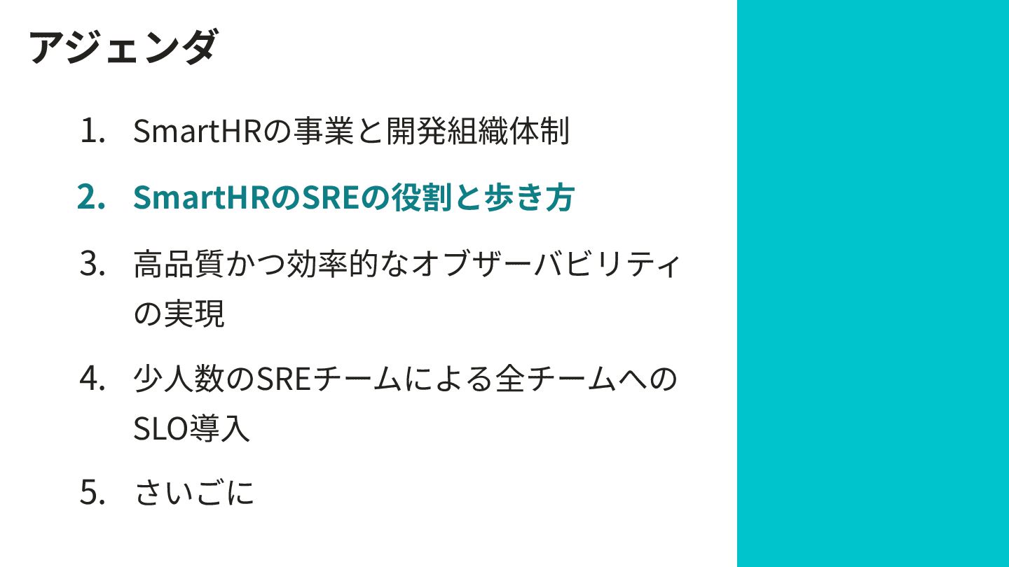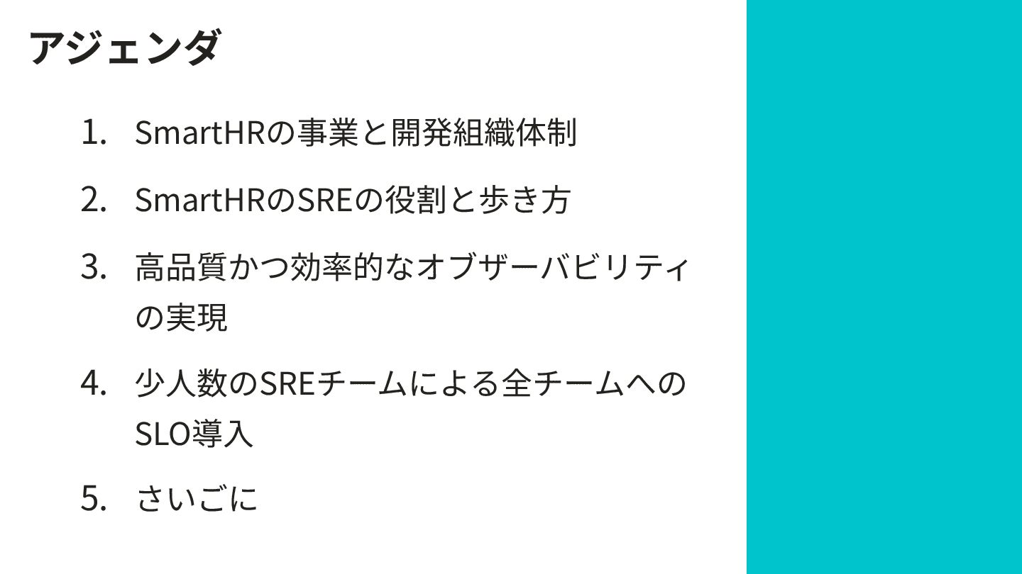 アジェンダ 1. SmartHRの事業と開発組織体制 2. SmartHRのSREの役割と歩き⽅ 3. ⾼品質かつ効率的なオブザーバビリティ の実現 4. 少⼈数のSREチームによる全チームへの