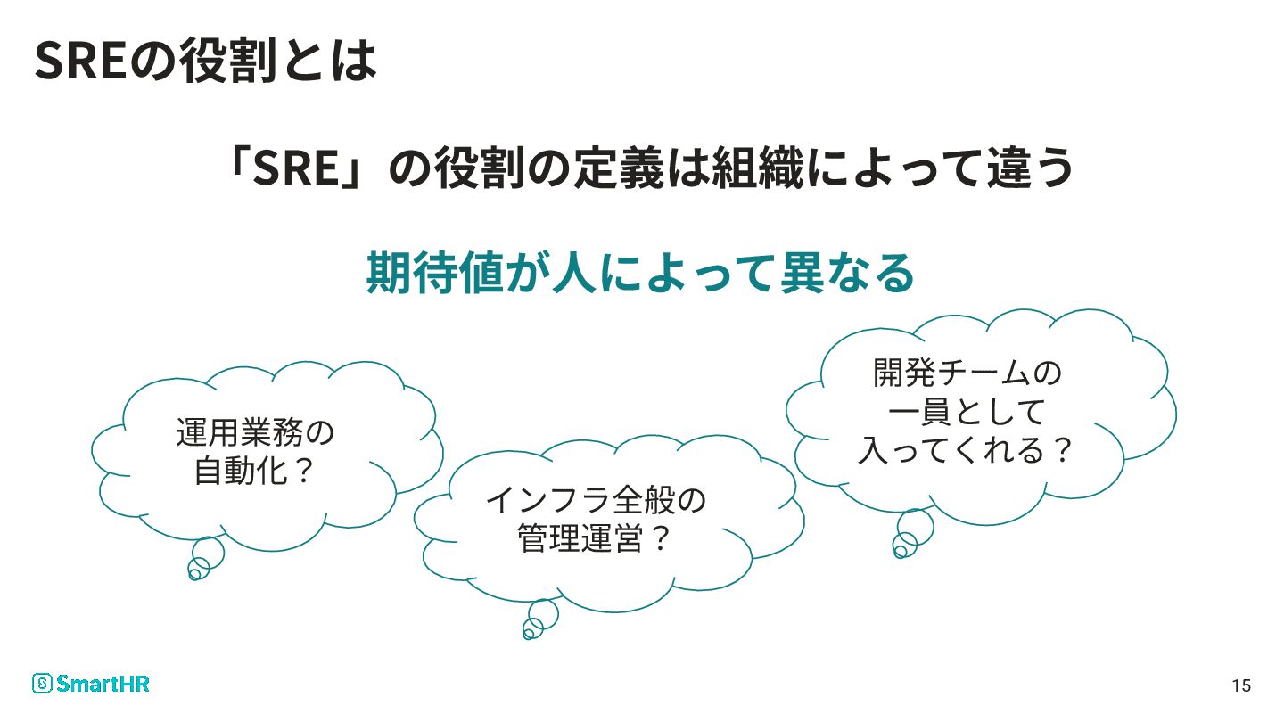 「SRE」の役割の定義は組織によって違う 期待値が⼈によって異なる SREの役割とは インフラ全般の 管理運営? 運⽤業務の ⾃動化? 開発チームの ⼀員として ⼊ってくれる?