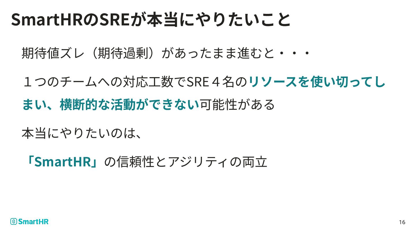 SmartHRのSREが本当にやりたいこと 期待値ズレ(期待過剰)があったまま進むと‧‧‧ 1つのチームへの対応⼯数でSRE4名のリソースを使い切ってし まい、横断的な活動ができない可能性がある 本当にやりたいのは、 「SmartHR」の信頼性とアジリティの両⽴ 16