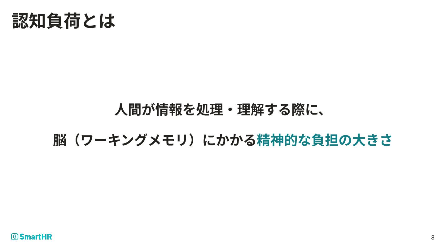 認知負荷とは ⼈間が情報を処理‧理解する際に、 脳(ワーキングメモリ)にかかる精神的な負担の⼤きさ 3