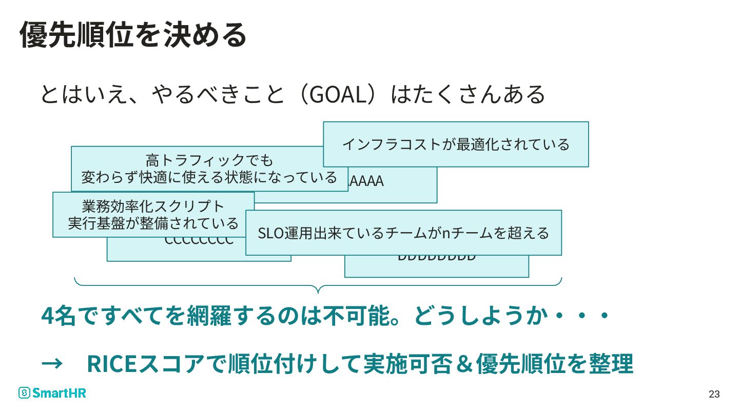 とはいえ、やるべきこと(GOAL)はたくさんある CCCCCCCC AAAAAAAAA DDDDDDDD 業務効率化スクリプト 実⾏基盤が整備されている ⾼トラフィックでも 変わらず快適に使える状態になっている インフラコストが最適化されている SLO運⽤出来ているチームがnチームを超える