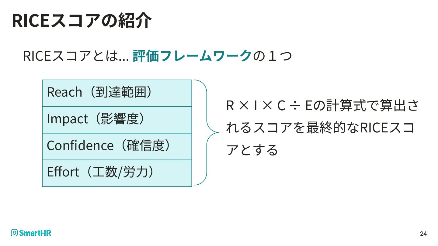 RICEスコアとは... 評価フレームワークの1つ Reach(到達範囲) Impact(影響度) Confidence(確信度) Effort(⼯数/労⼒) 24 RICEスコアの紹介 R ×