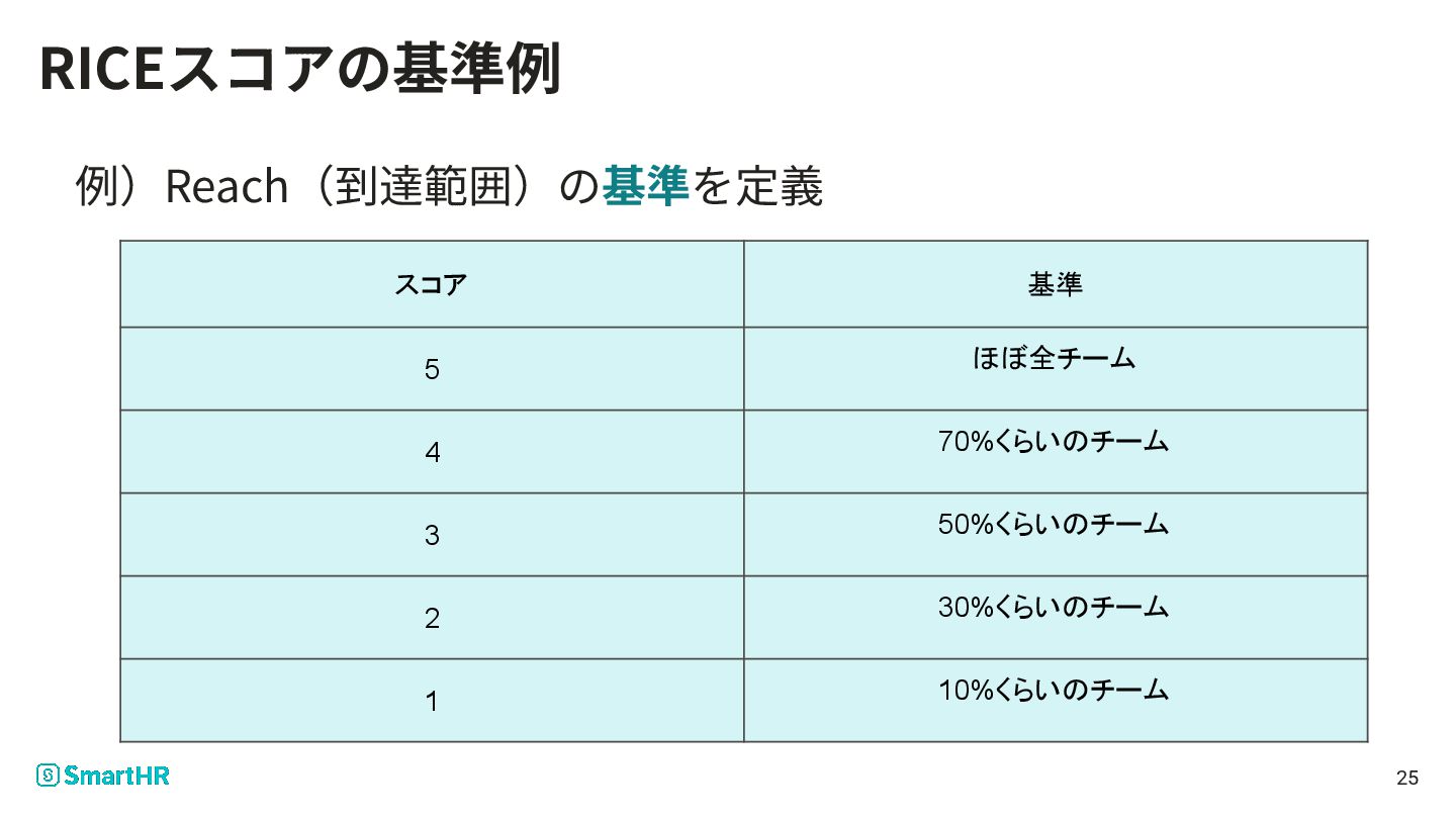 1 10%くらいのチーム 例)Reach(到達範囲)の基準を定義 25 RICEスコアの基準例