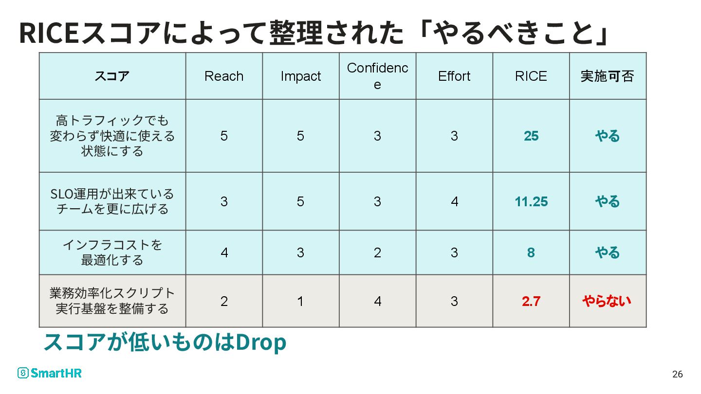 状態にする 5 5 3 3 25 やる SLO運⽤が出来ている チームを更に広げる 3 5 3 4 11.25 やる インフラコストを 最適化する 4 3 2 3 8 やる 業務効率化スクリプト 実⾏基盤を整備する 2 1 4 3 2.7 やらない スコアが低いものはDrop 26 RICEスコアによって整理された「やるべきこと」