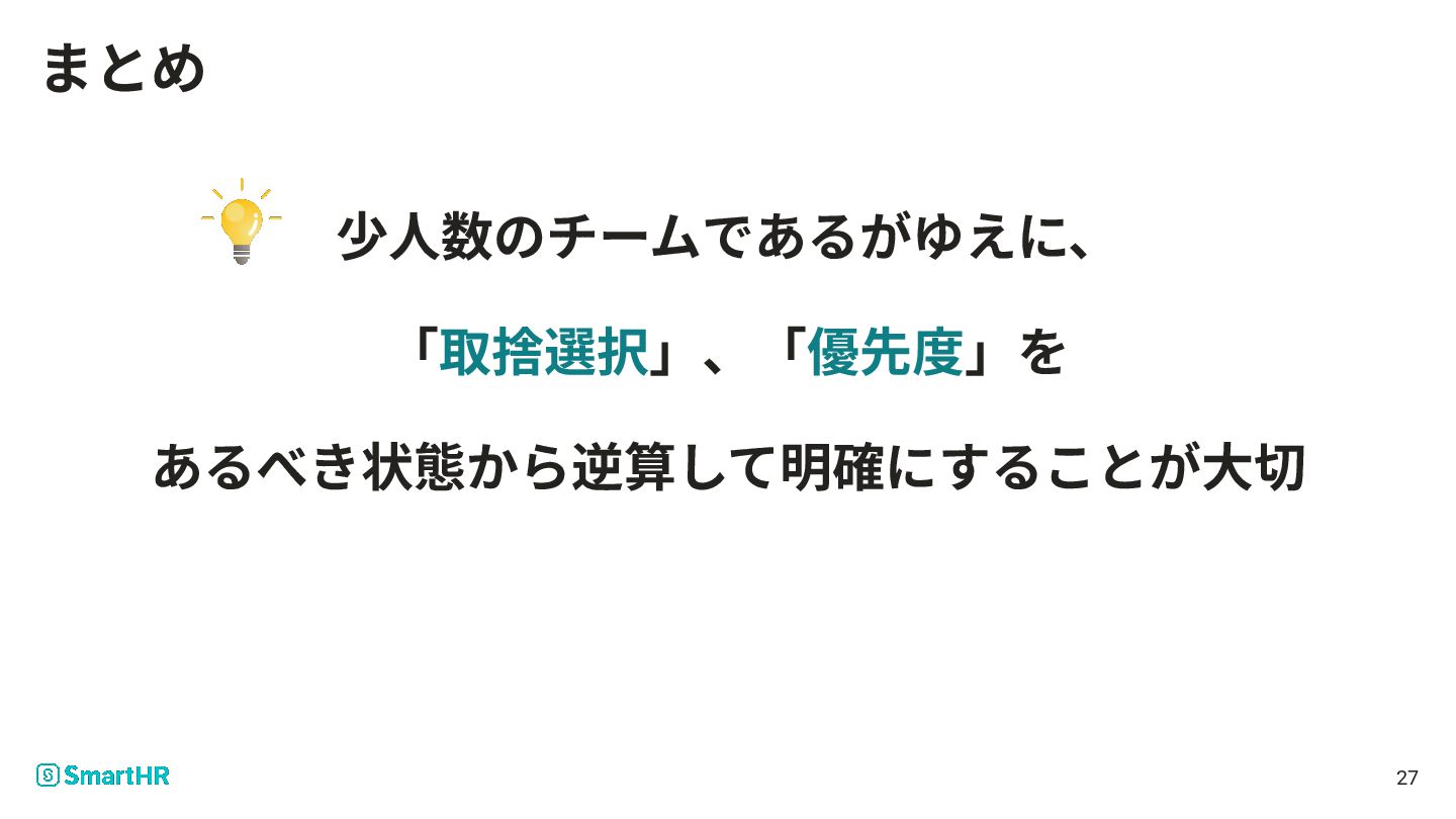 少⼈数のチームであるがゆえに、 「取捨選択」、「優先度」を あるべき状態から逆算して明確にすることが⼤切 27 まとめ