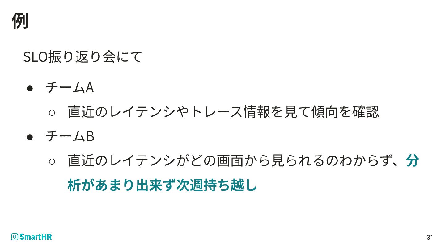 SLO振り返り会にて • チームA ◦ 直近のレイテンシやトレース情報を⾒て傾向を確認 • チームB ◦ 直近のレイテンシがどの画⾯から⾒られるのわからず、分 析があまり出来ず次週持ち越し