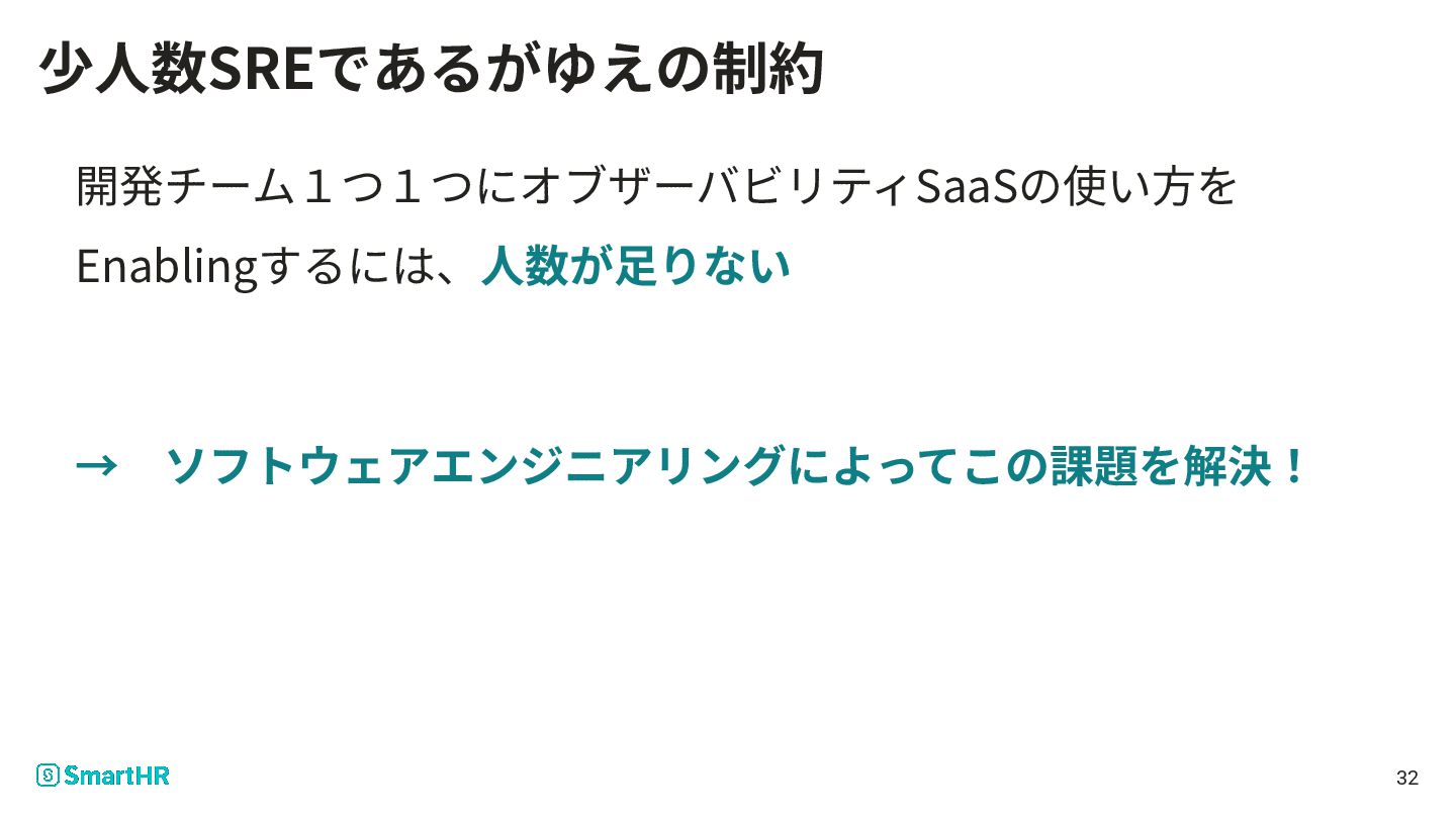 32 開発チーム1つ1つにオブザーバビリティSaaSの使い⽅を Enablingするには、⼈数が⾜りない → ソフトウェアエンジニアリングによってこの課題を解決! 少⼈数SREであるがゆえの制約