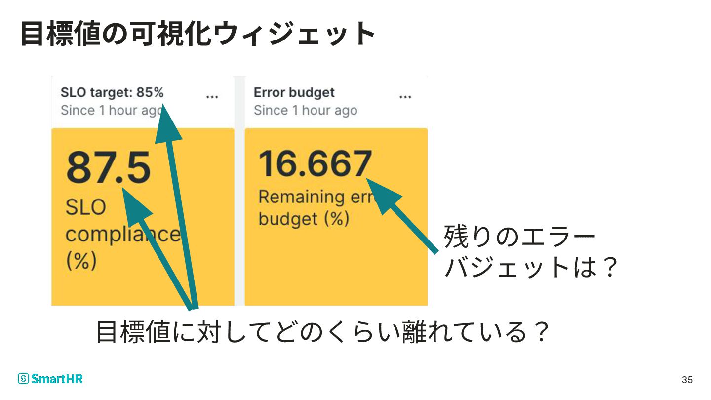 ⽬標値に対してどのくらい離れている? 残りのエラー バジェットは? 35 ⽬標値の可視化ウィジェット