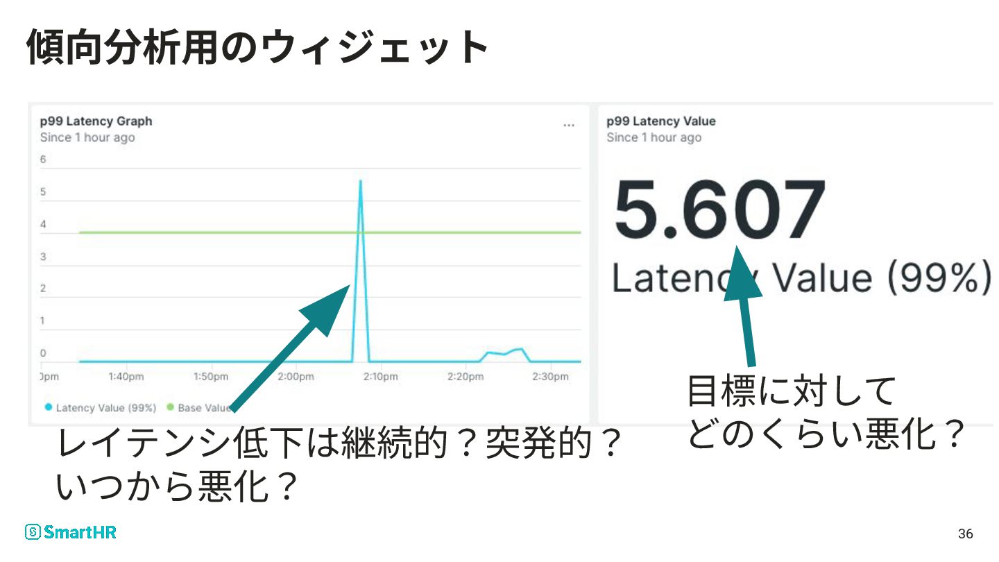 レイテンシ低下は継続的?突発的? いつから悪化? ⽬標に対して どのくらい悪化? 36 傾向分析⽤のウィジェット