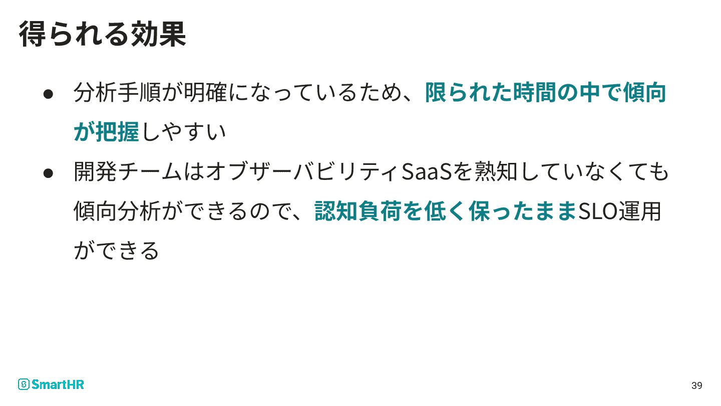 39 得られる効果 • 分析⼿順が明確になっているため、限られた時間の中で傾向 が把握しやすい • 開発チームはオブザーバビリティSaaSを熟知していなくても 傾向分析ができるので、認知負荷を低く保ったままSLO運⽤ ができる