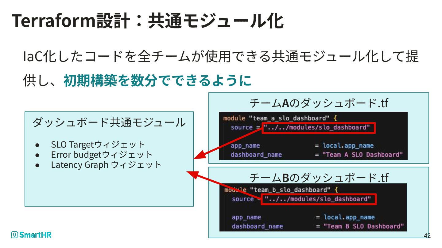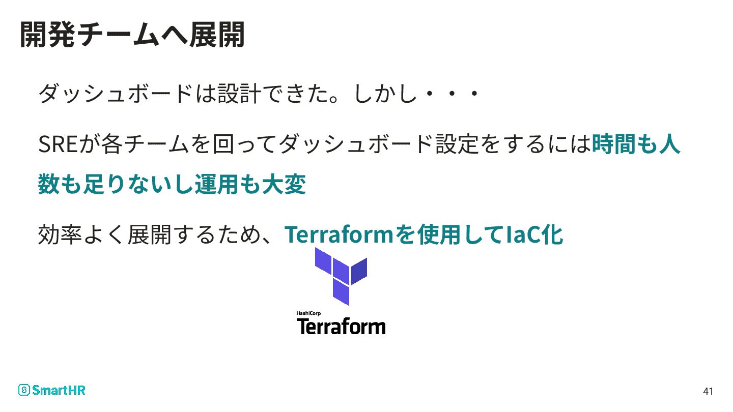41 開発チームへ展開 ダッシュボードは設計できた。しかし‧‧‧ SREが各チームを回ってダッシュボード設定をするには時間も⼈ 数も⾜りないし運⽤も⼤変 効率よく展開するため、Terraformを使⽤してIaC化