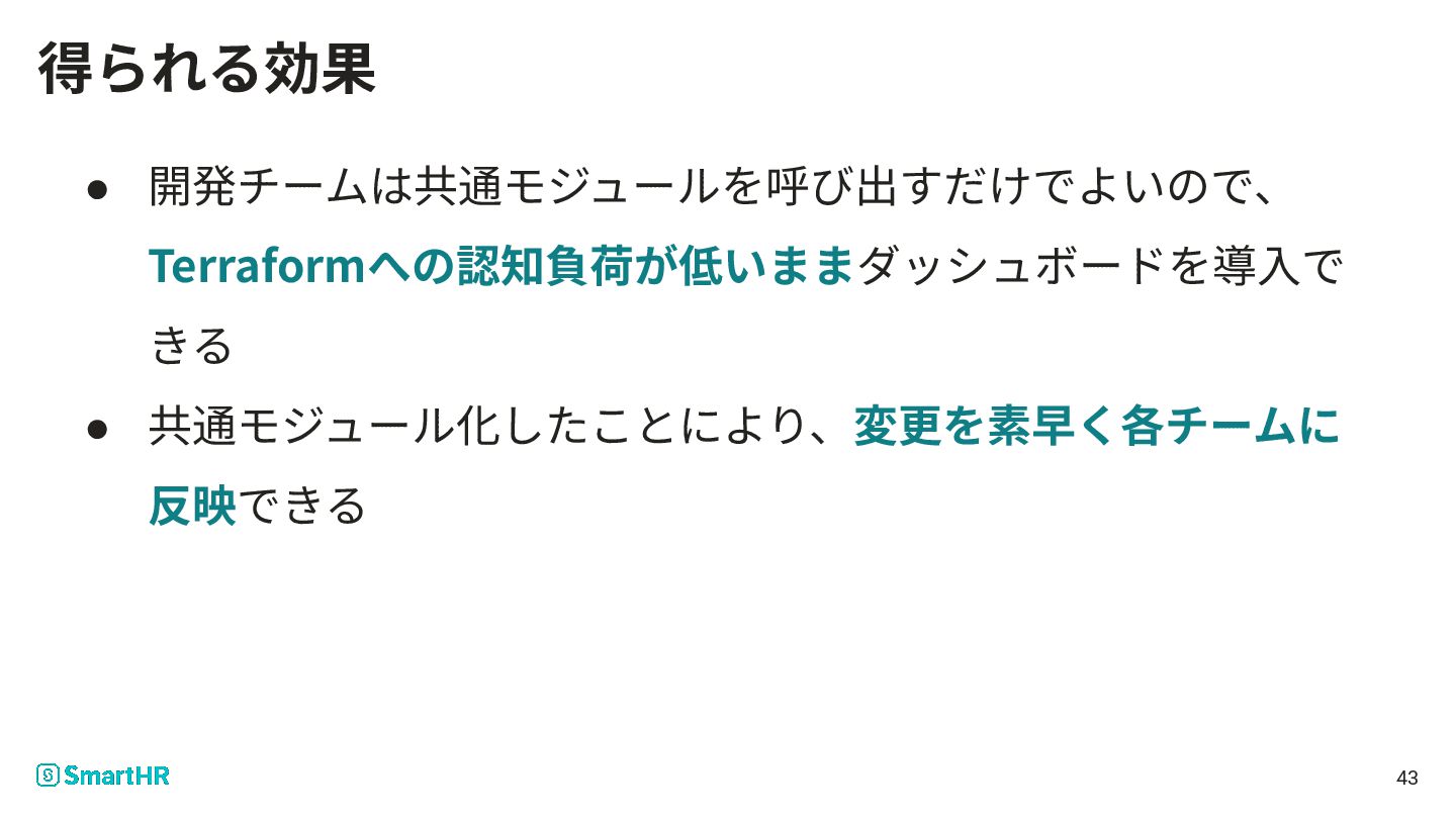 43 得られる効果 • 開発チームは共通モジュールを呼び出すだけでよいので、 Terraformへの認知負荷が低いままダッシュボードを導⼊で きる • 共通モジュール化したことにより、変更を素早く各チームに 反映できる