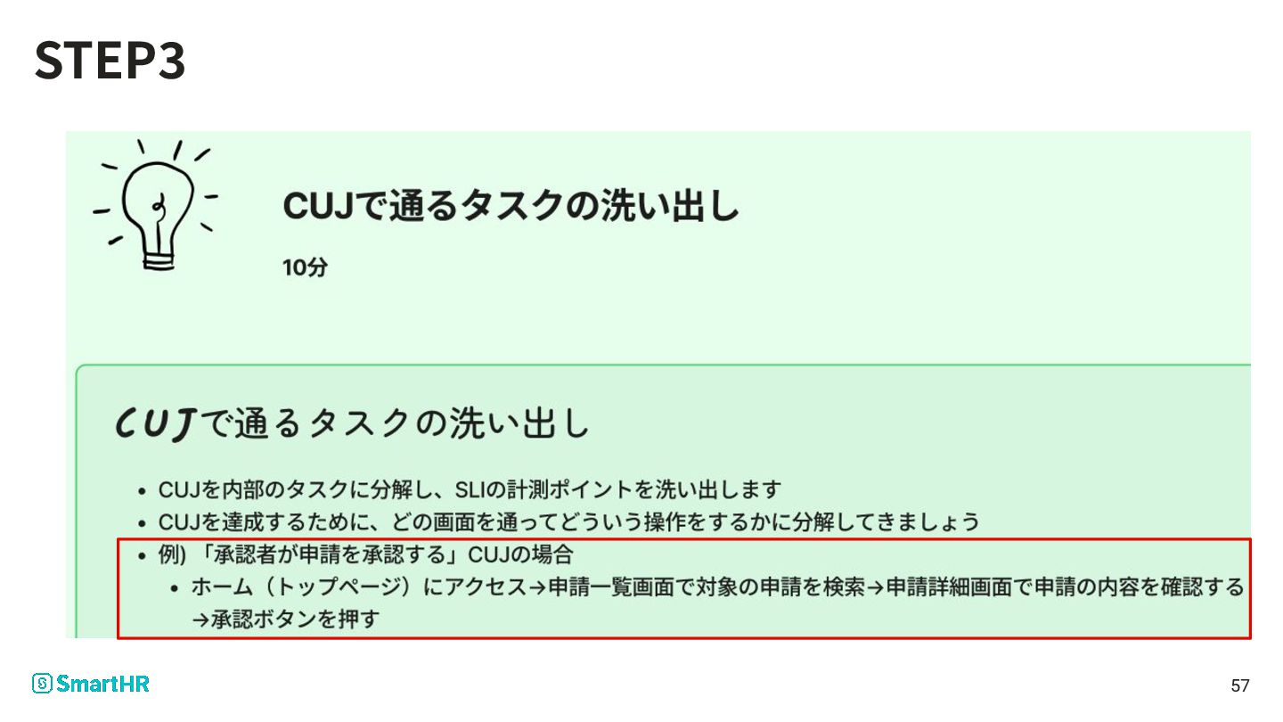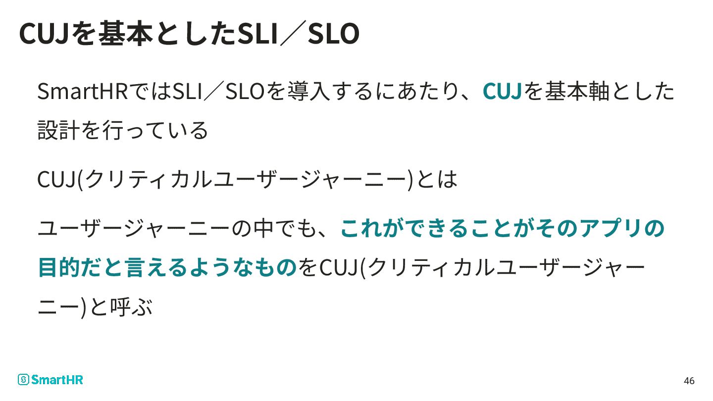 SmartHRではSLI∕SLOを導⼊するにあたり、CUJを基本軸とした 設計を⾏っている CUJ(クリティカルユーザージャーニー)とは ユーザージャーニーの中でも、これができることがそのアプリの ⽬的だと⾔えるようなものをCUJ(クリティカルユーザージャー ニー)と呼ぶ 46 CUJを基本としたSLI∕SLO