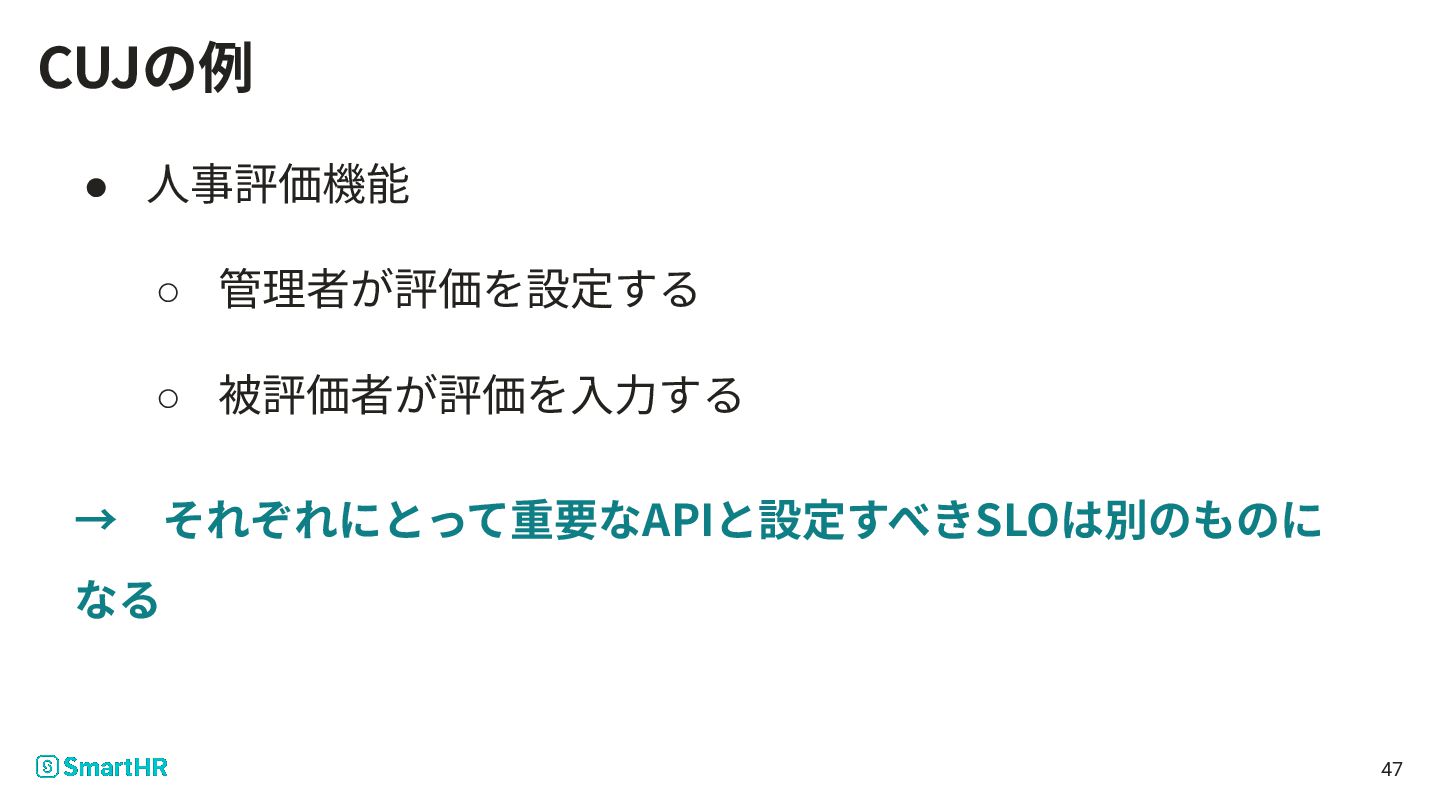 • ⼈事評価機能 ◦ 管理者が評価を設定する ◦ 被評価者が評価を⼊⼒する → それぞれにとって重要なAPIと設定すべきSLOは別のものに なる 47 CUJの例