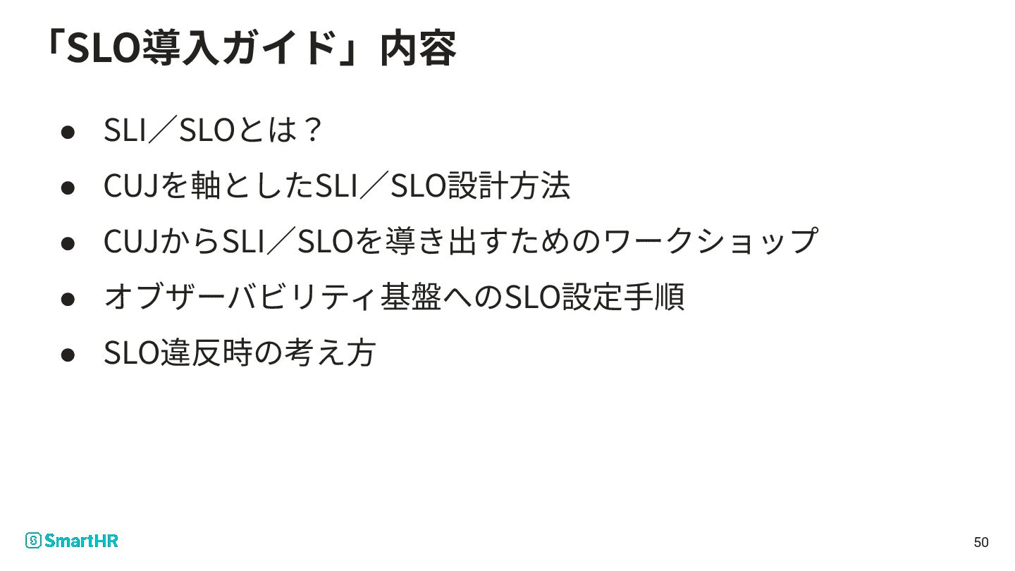 50 「SLO導⼊ガイド」内容 • SLI∕SLOとは? • CUJを軸としたSLI∕SLO設計⽅法 • CUJからSLI∕SLOを導き出すためのワークショップ • オブザーバビリティ基盤へのSLO設定⼿順
