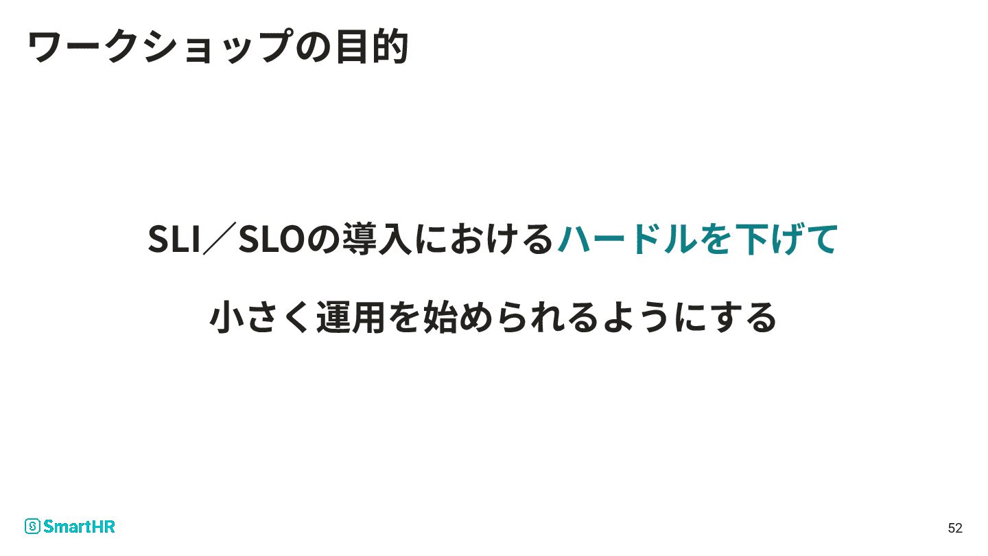 52 ワークショップの⽬的 SLI∕SLOの導⼊におけるハードルを下げて ⼩さく運⽤を始められるようにする